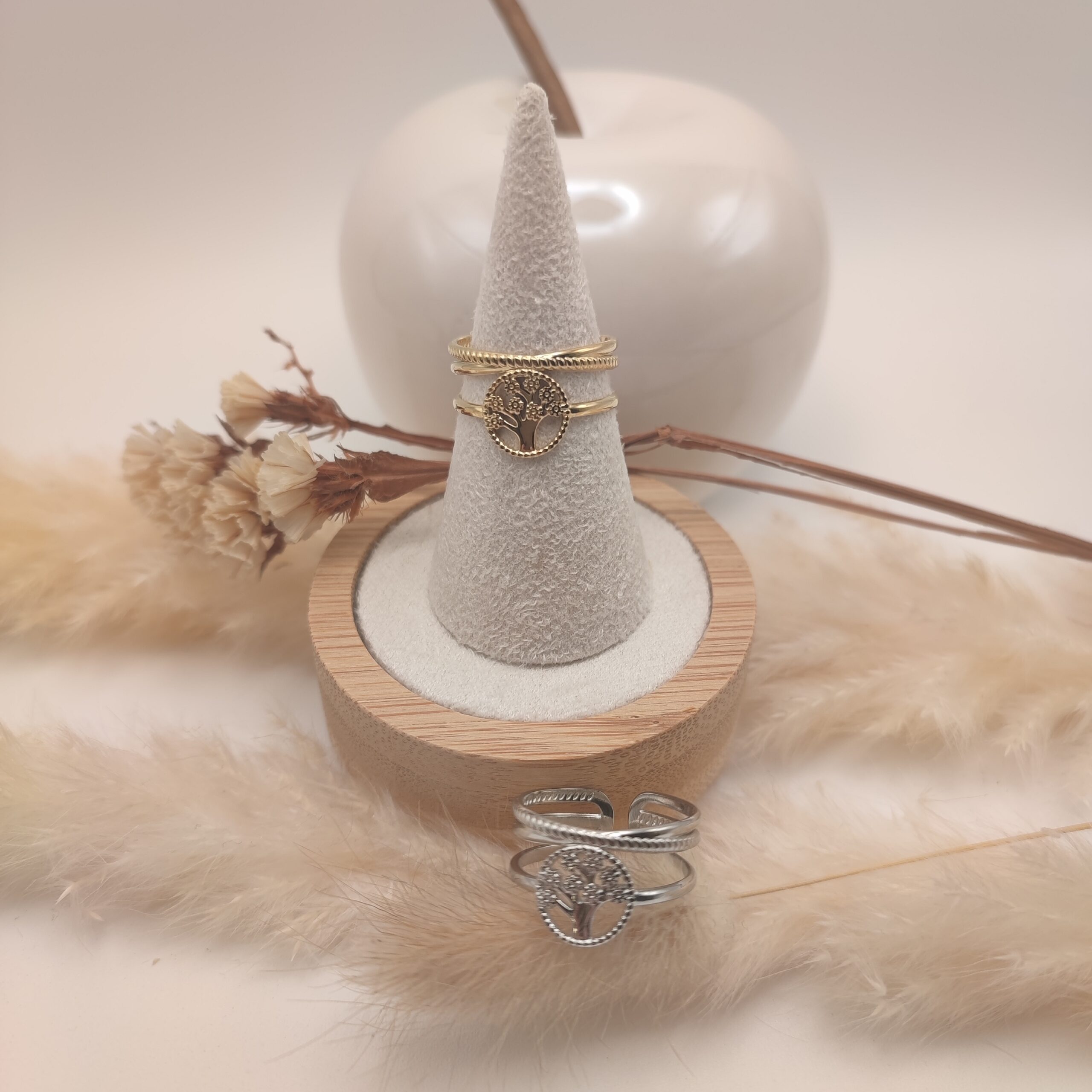 Bague fine en acier inoxydable dorée avec un arbre de vie ajouré pour un jeu de transparence avec la peau.