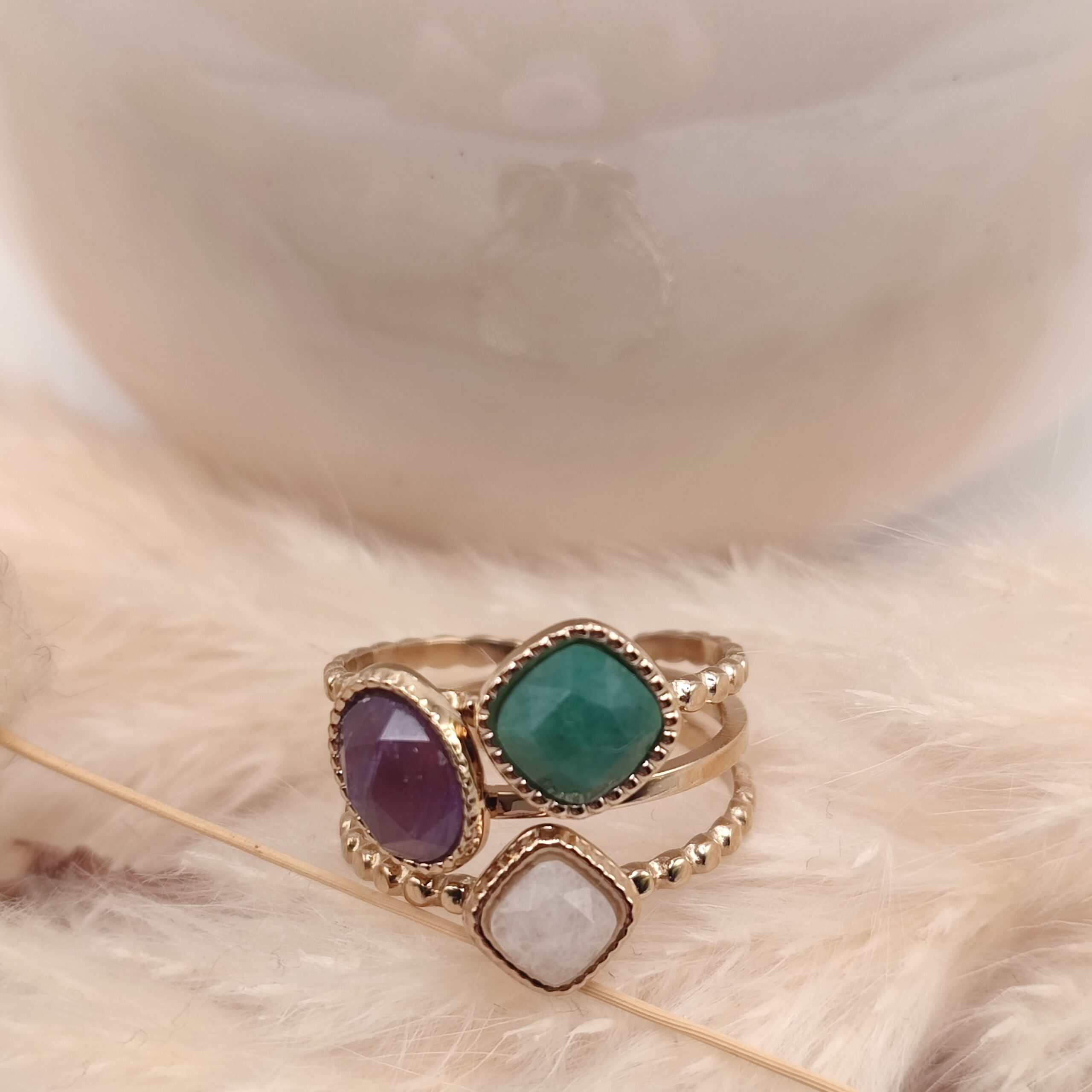Améthyste, Agathe blanche, Jade vert.