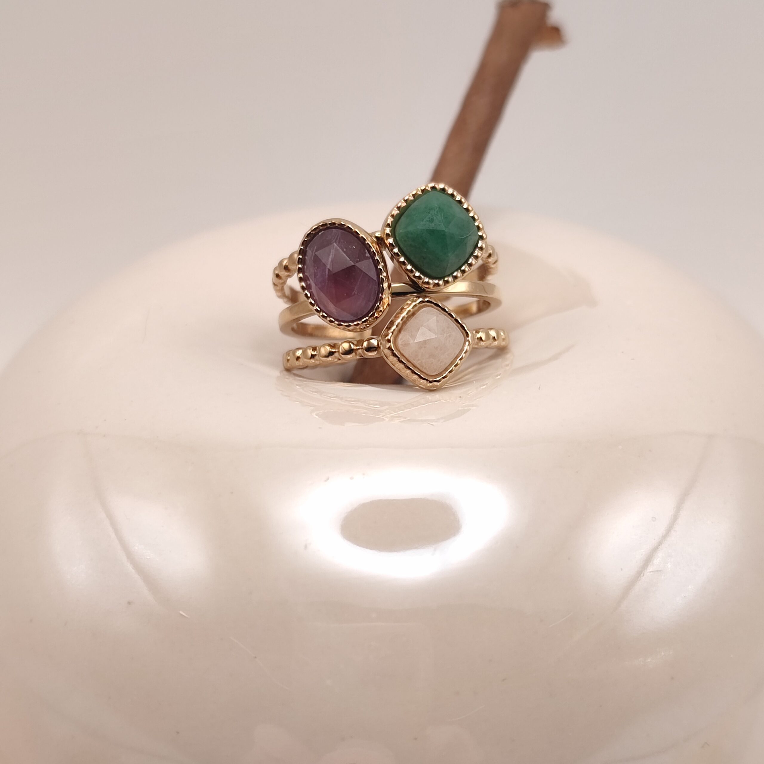 Bague en acier inoxydable composée de 3 anneaux effet mil grain et de 3 pierres naturelles carrées et ovale.