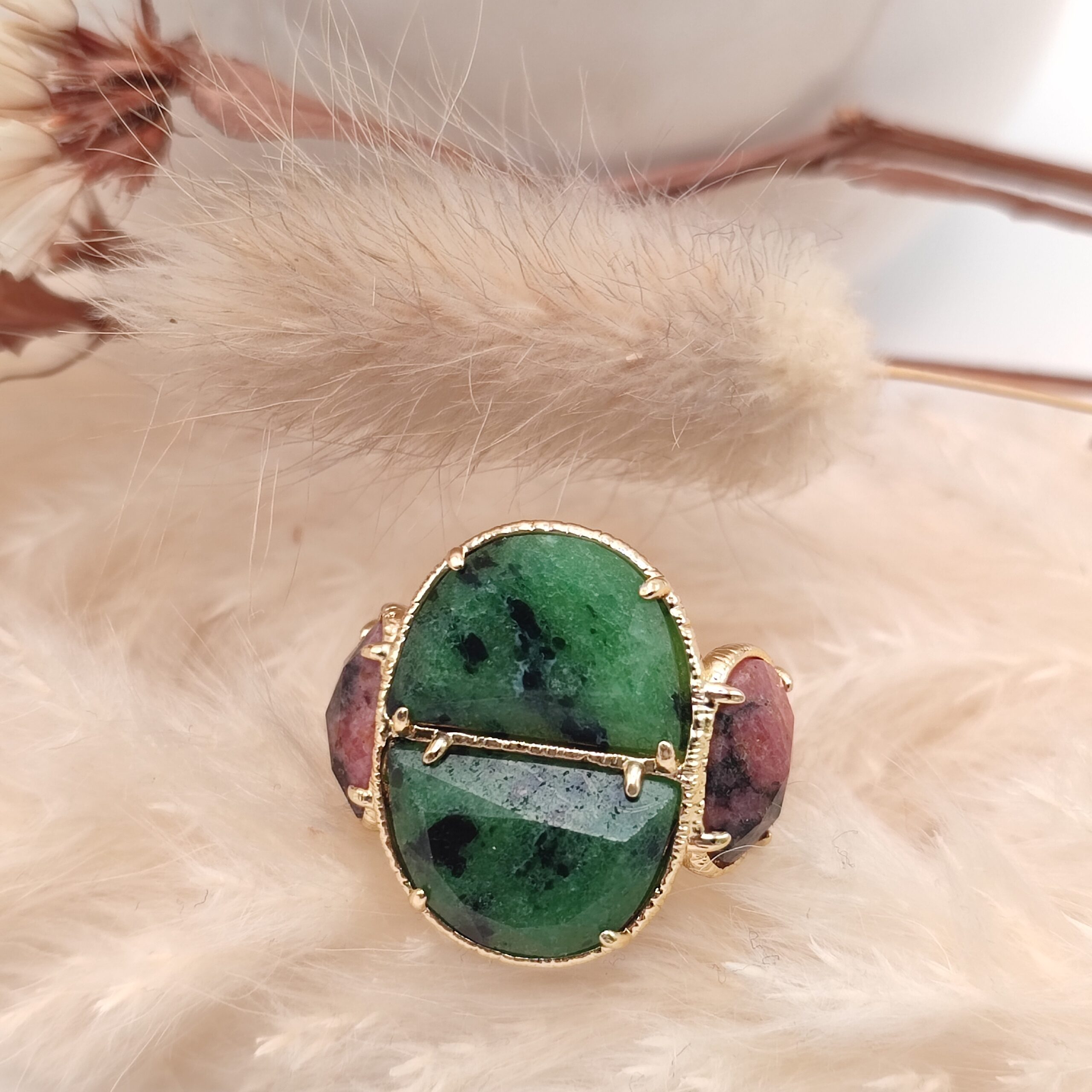 Bague large de type chevalière sertie de magnifiques pierres naturelles travaillées et facettées, en laiton doré renforcées à l’or fin. design innovant.