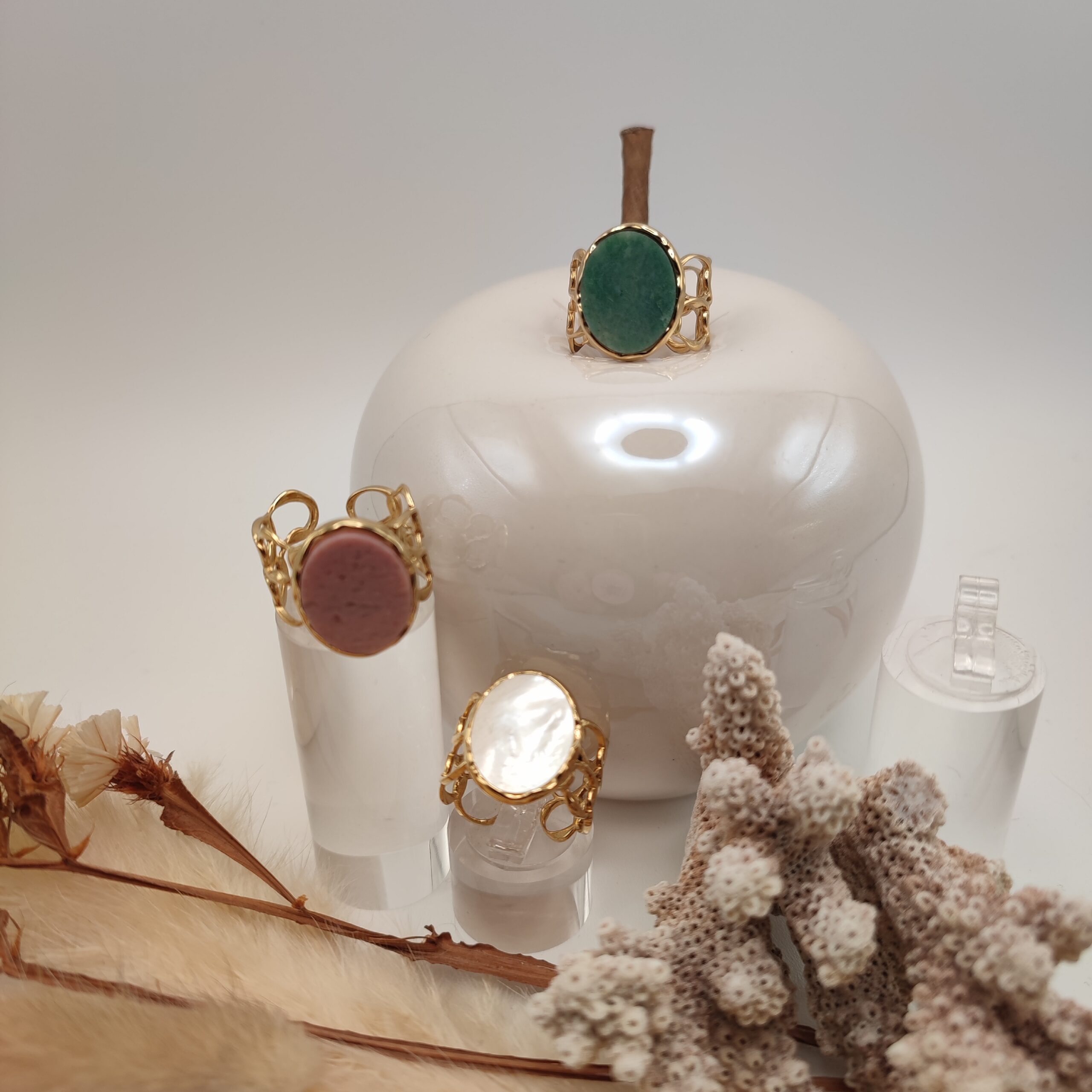 Bague maximaliste et rétro en acier inoxydable composée d’une pierre naturelle ovale plate sur un anneau en forme de maille ovale ajourée.