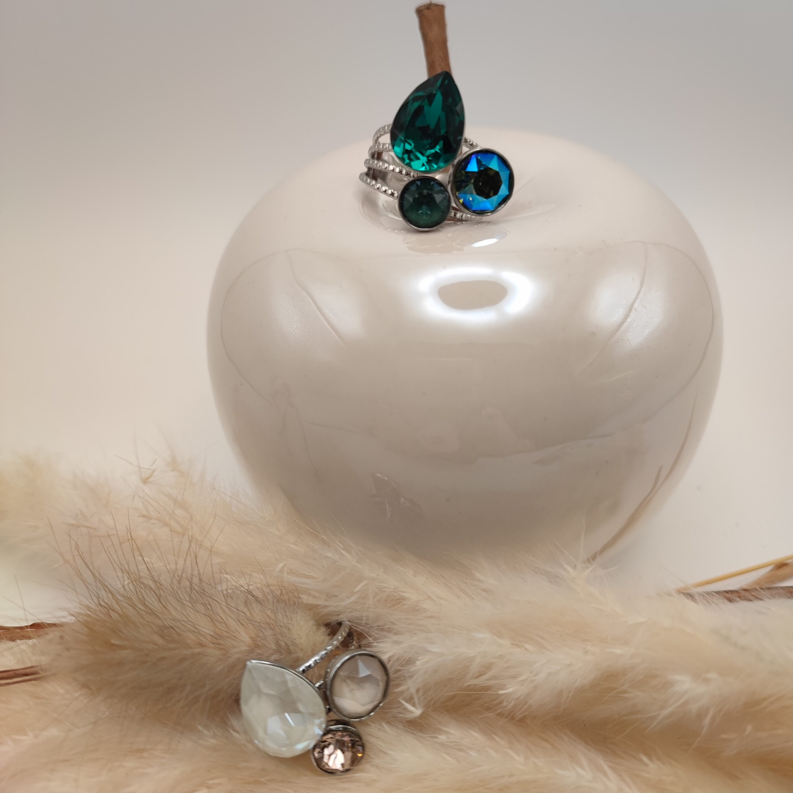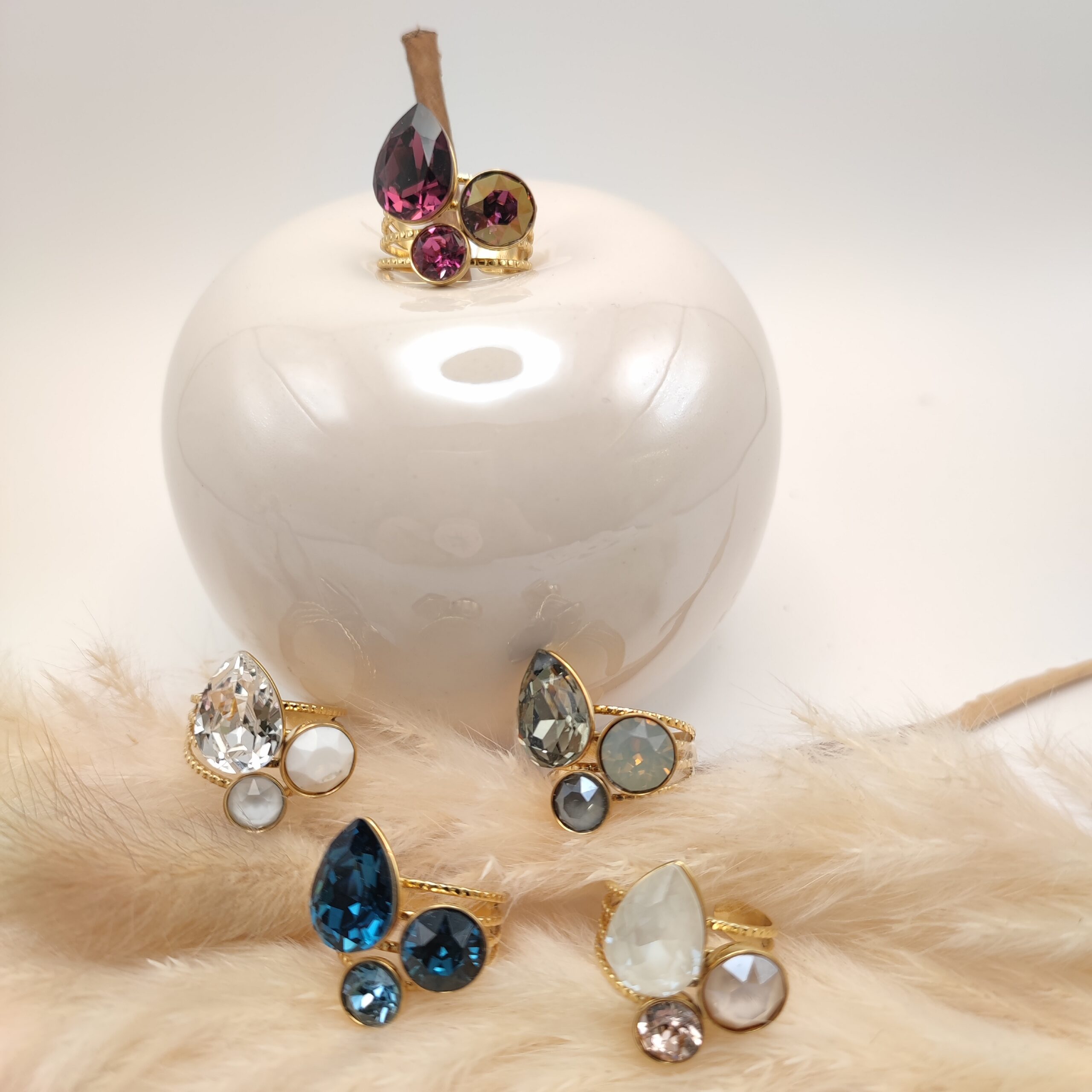 Bague maximaliste et Graphique en acier inoxydable composée de cristaux Swarovski® en forme de goutte et de ronds.