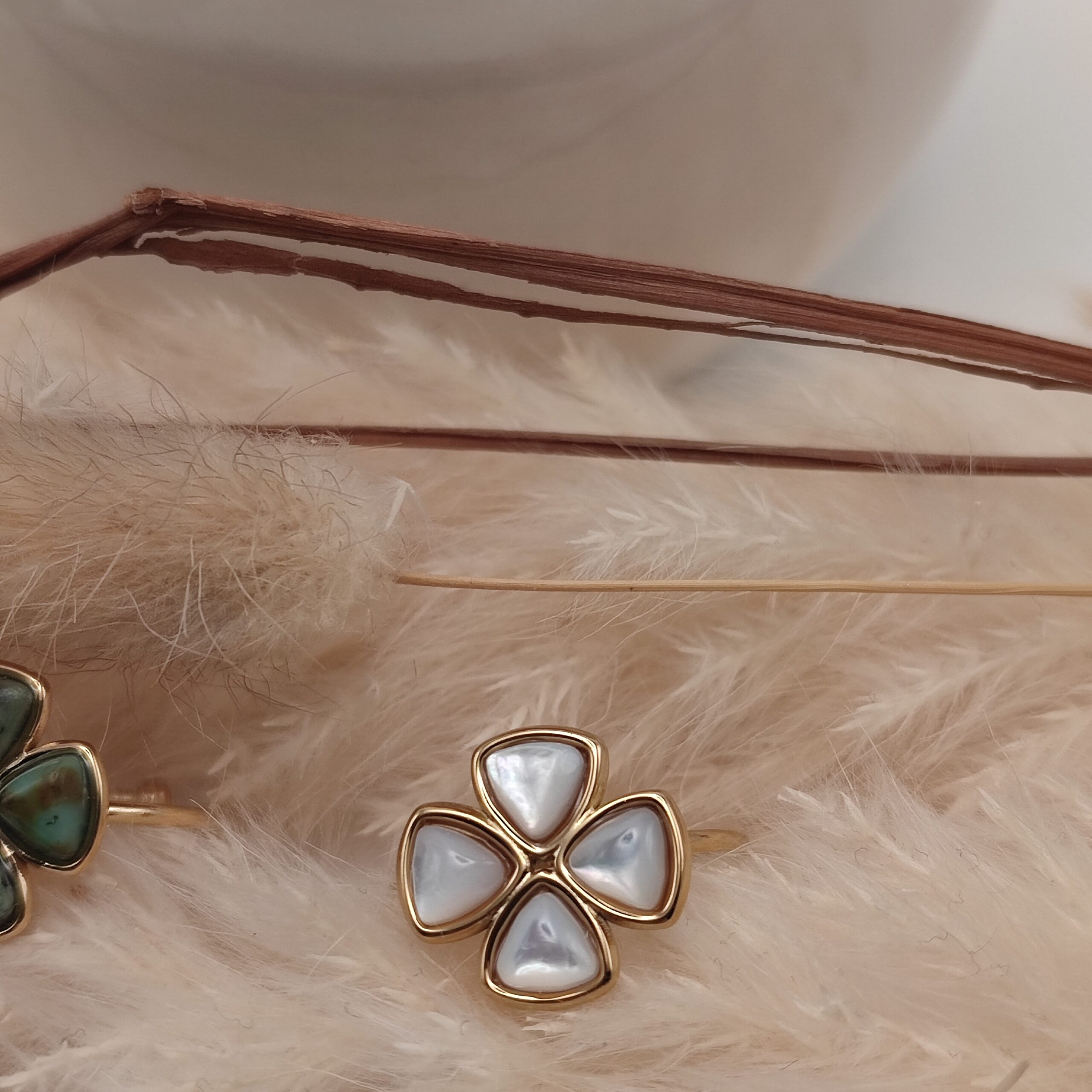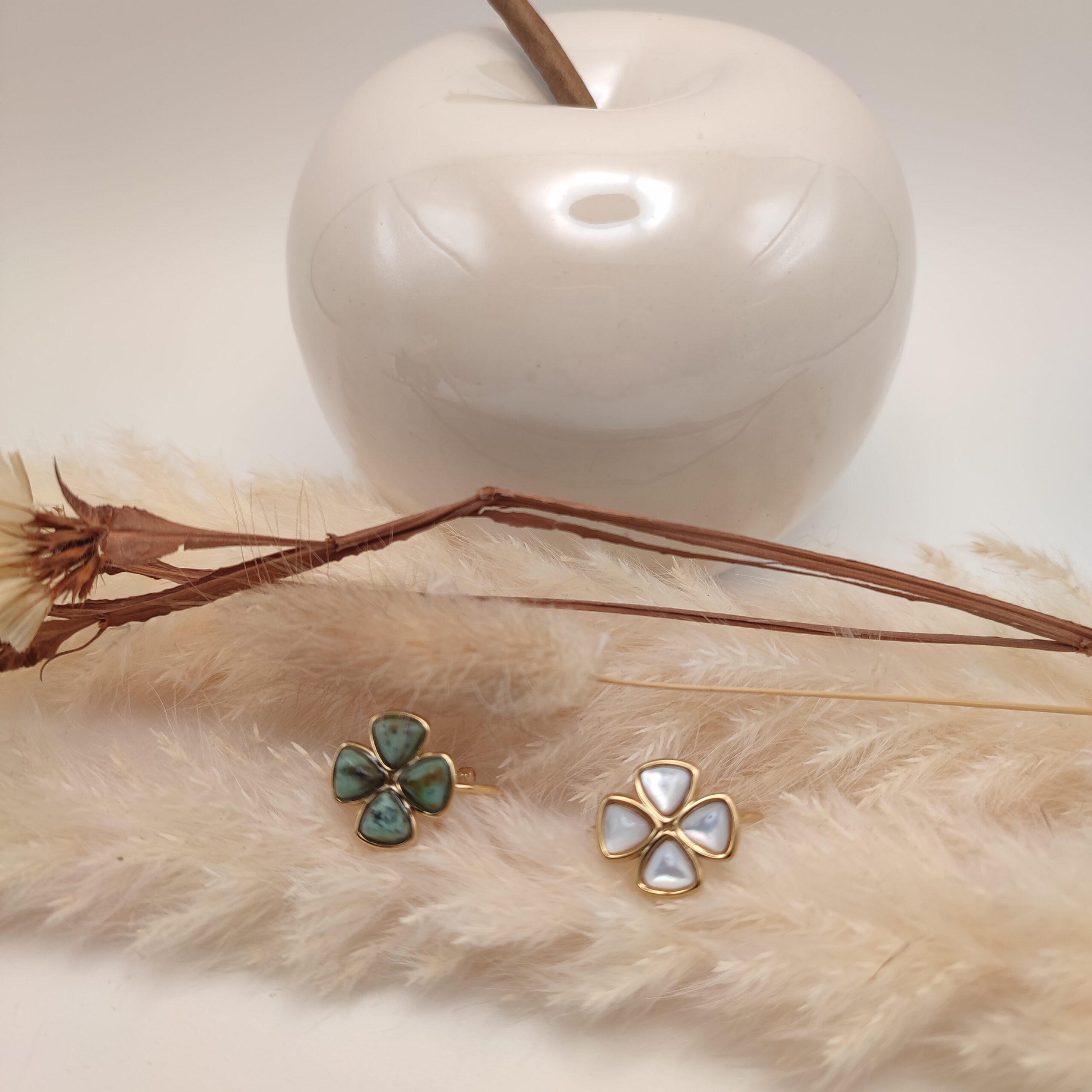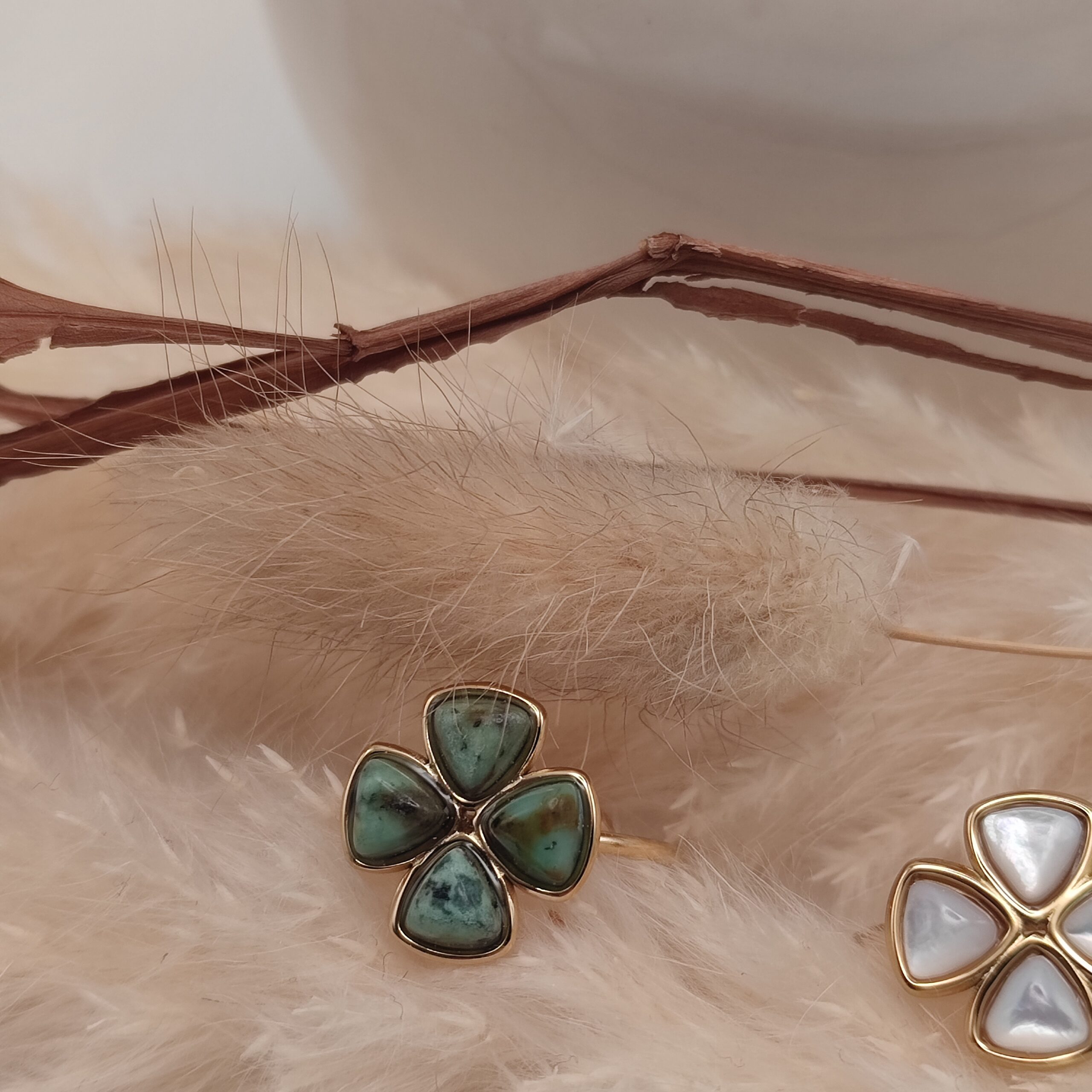 Bague fine en acier inoxydable composée d’un motif trèfle à 4 feuilles en pierre naturelle. Deux modèles : turquoise africaine reconstituée; nacre.