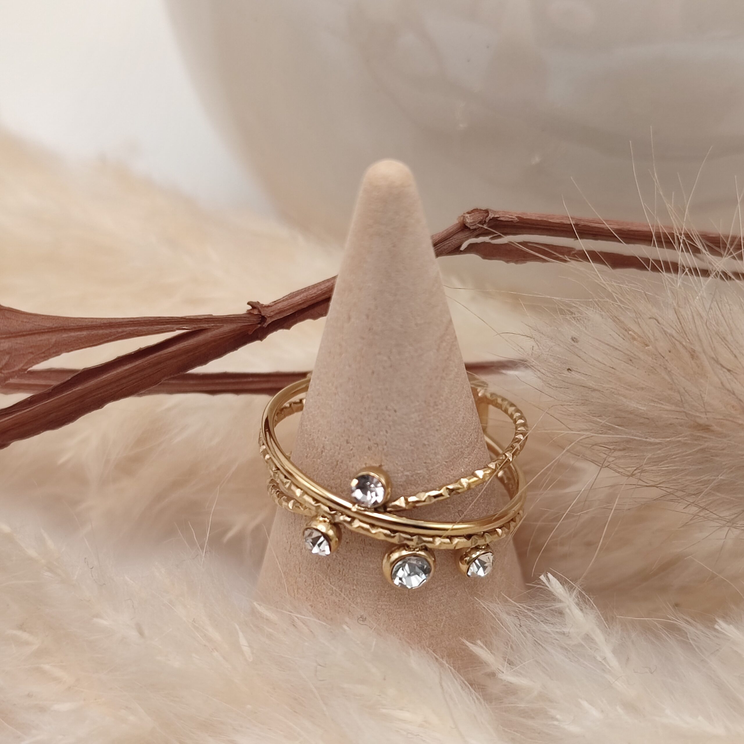 Bague fine en acier inoxydable doré composée d’un corps de bague double anneau aérien et de 4 oxydes de zirconium .