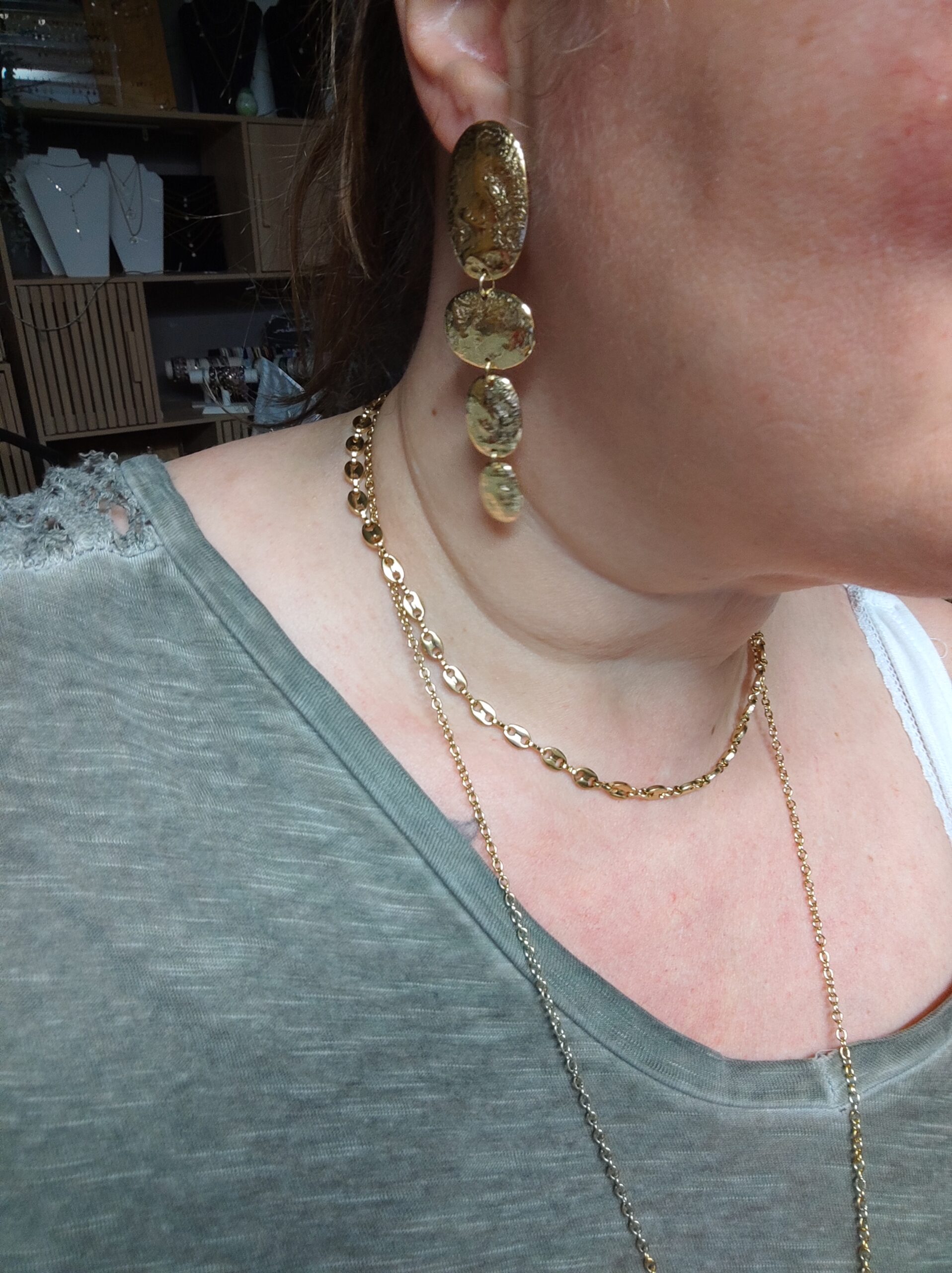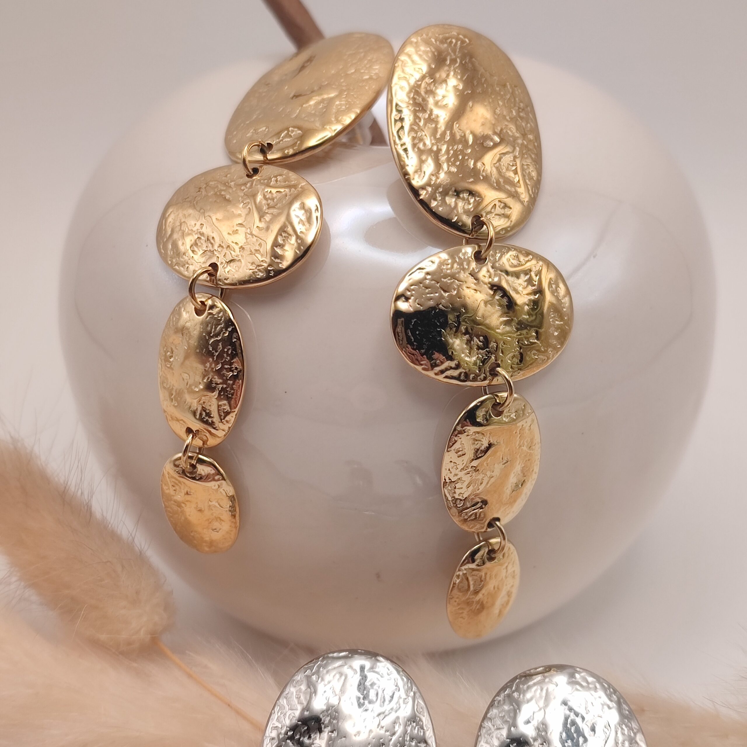 Boucles d’oreilles graphiques pendantes à puce composées de quatre pièces martelées et reliées. Fermoir papillon.