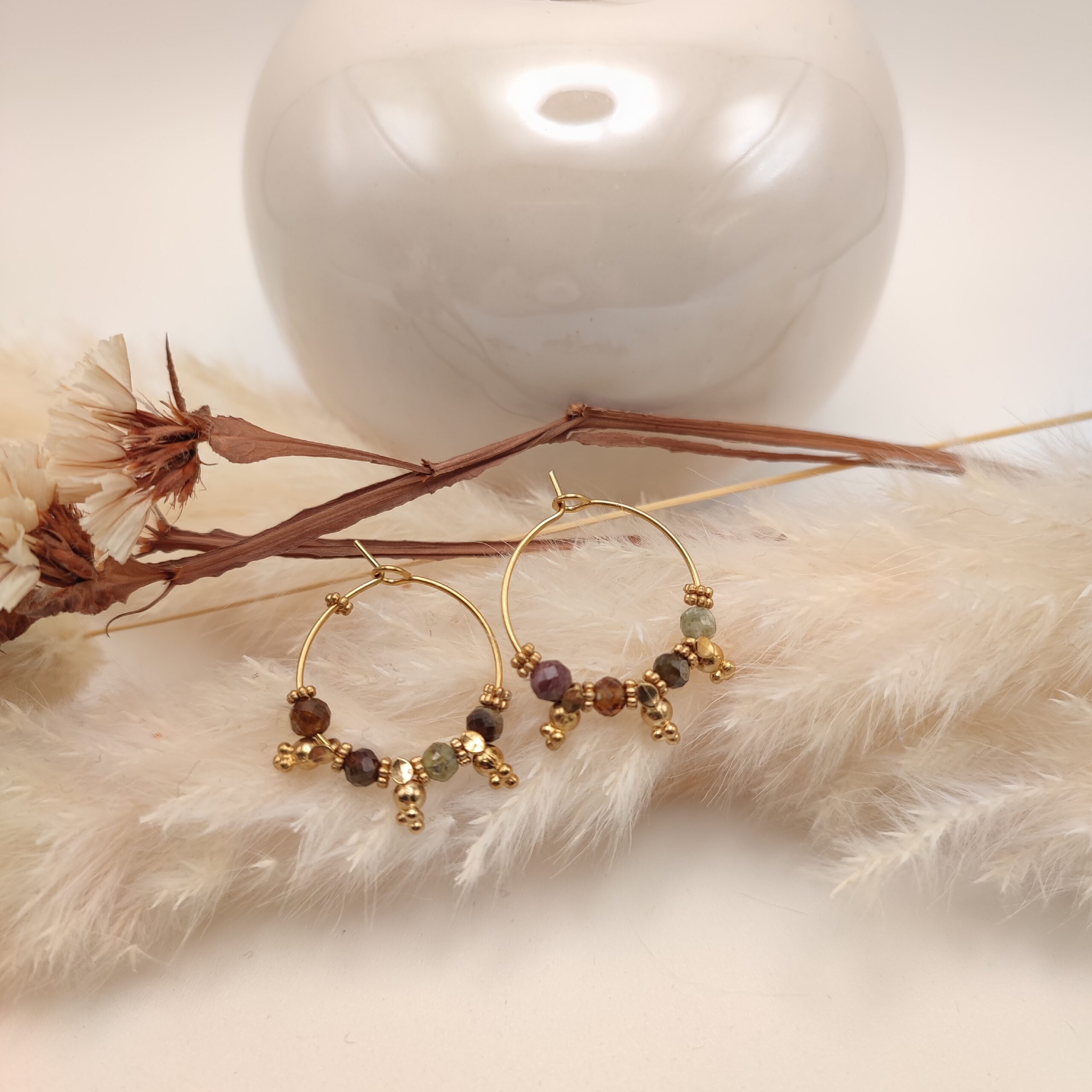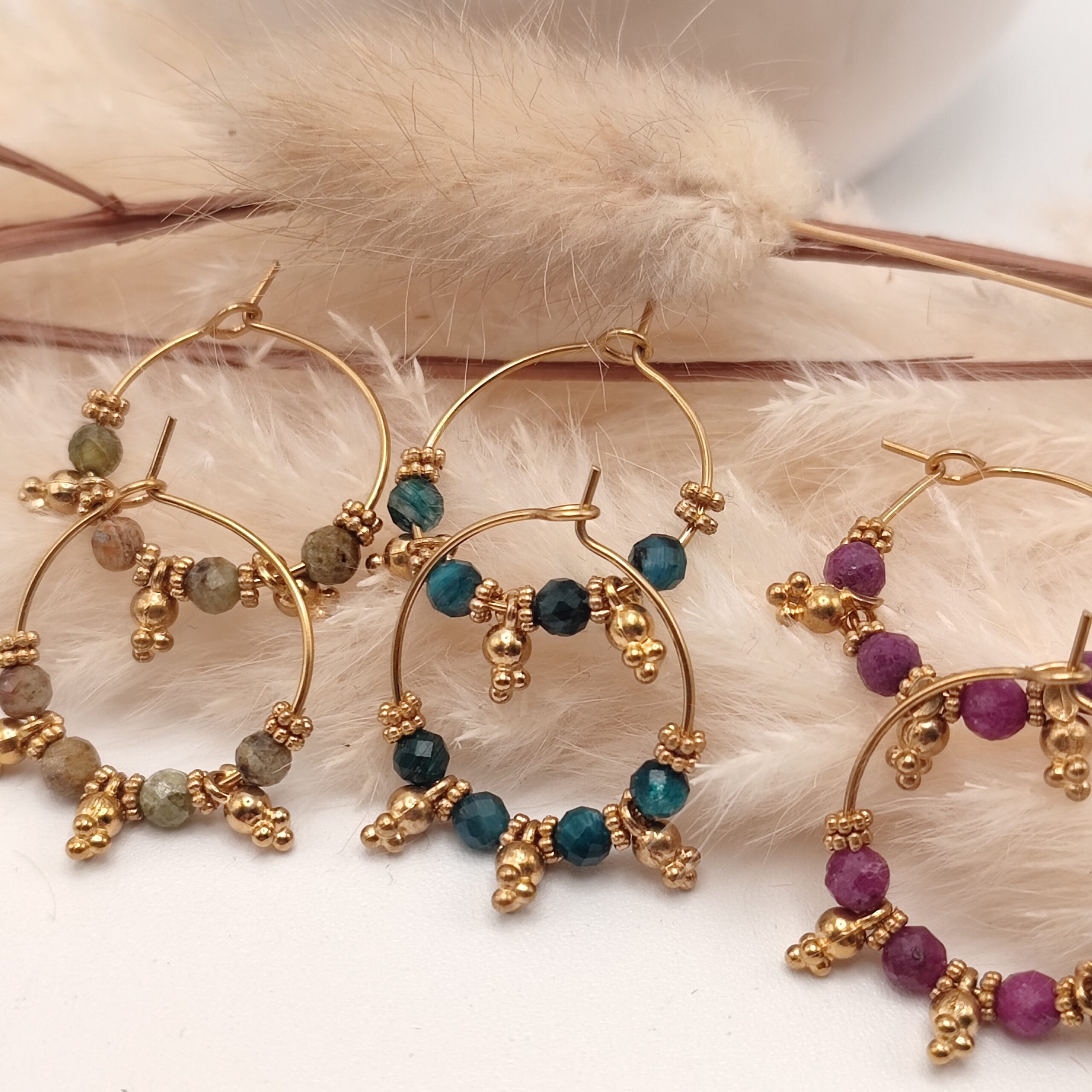 Elles sont en acier plaqué or 18k, les coloris sont nombreux grâce au jolies perles en cristal de bohème facettées de grande qualité et pour cette nouvelle version des pierres naturelles.