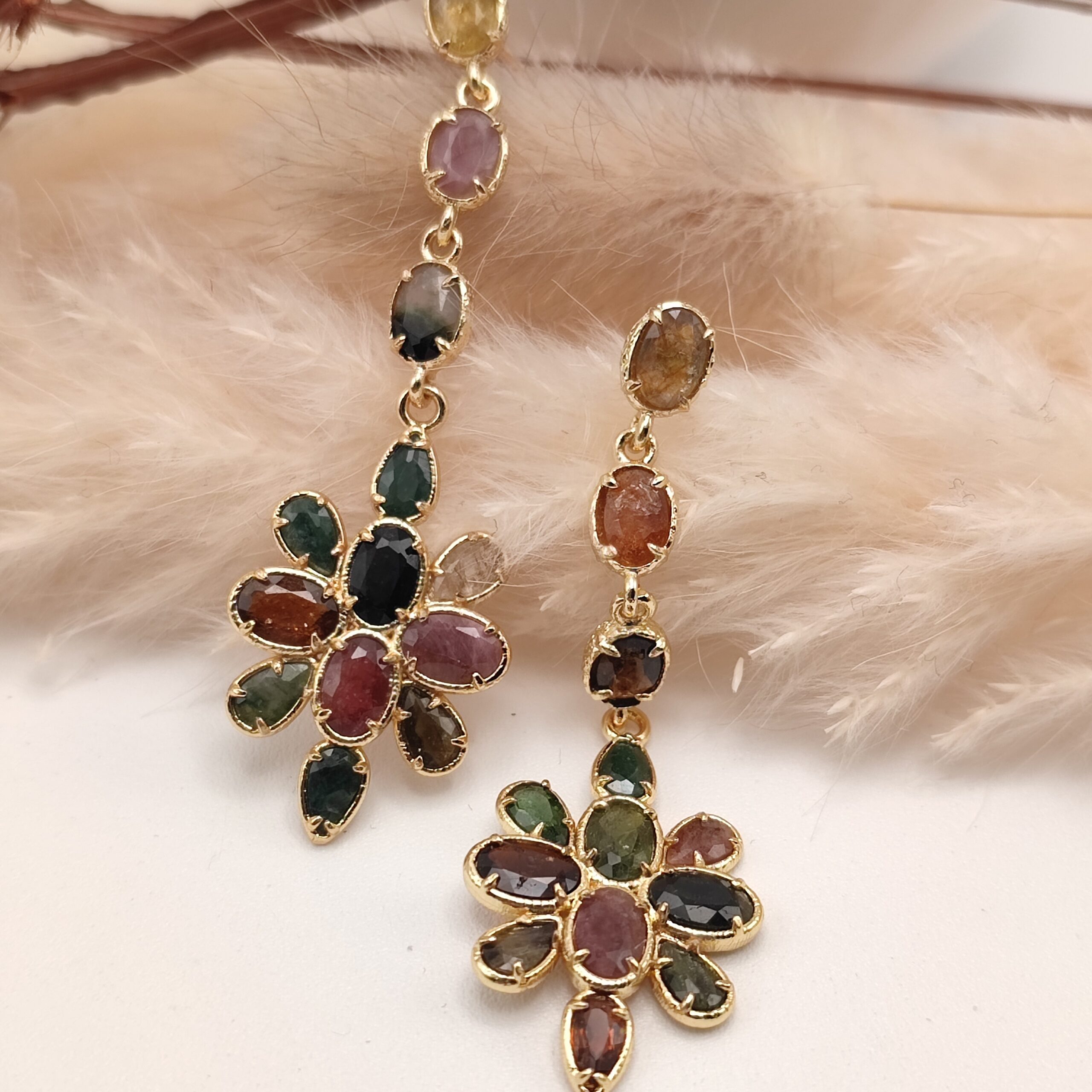 Boucles d’oreilles pendante en forme de Fleurs montées d’un seul bloc avec plusieurs magnifiques pierres naturelles taillées en ovales. Crochet en laiton.