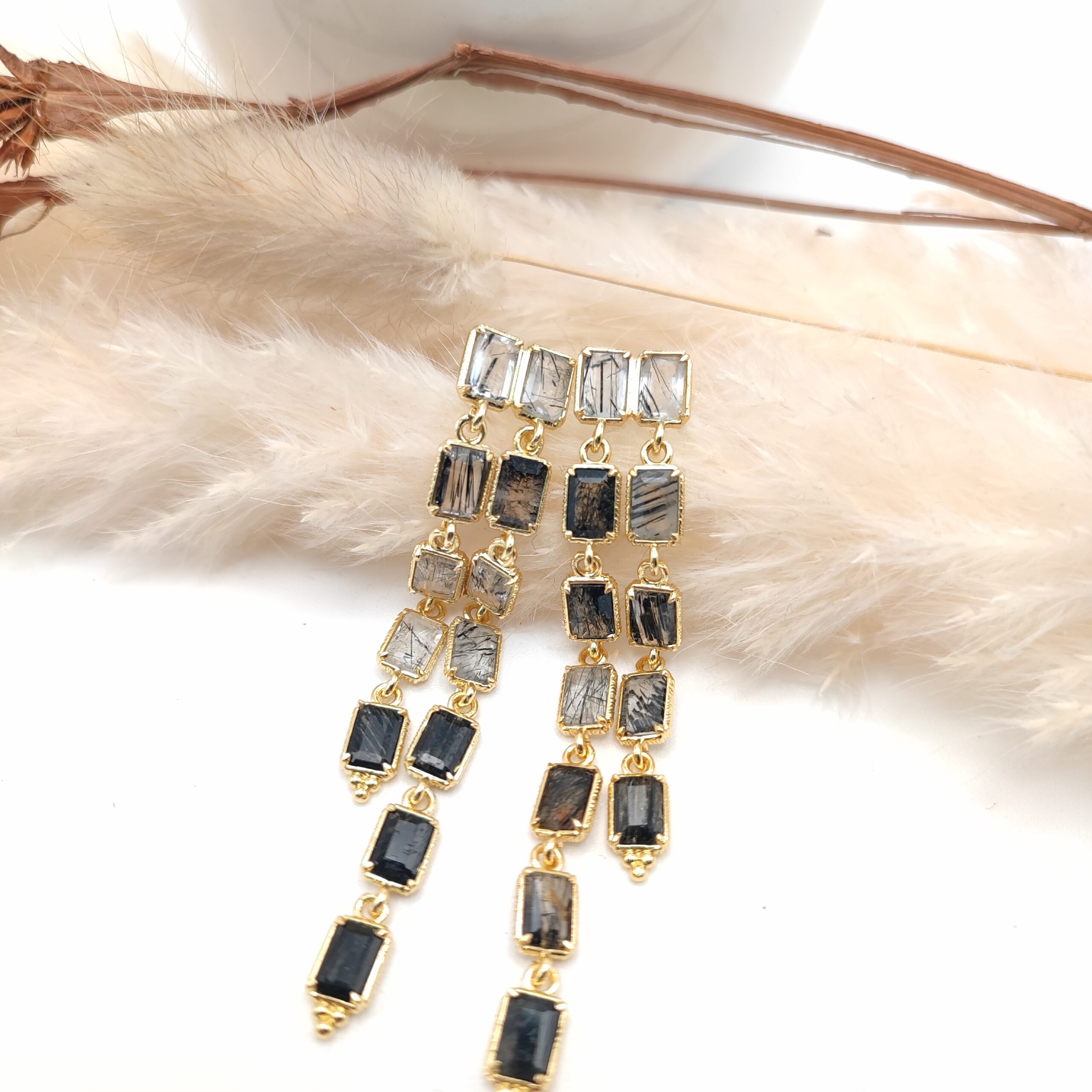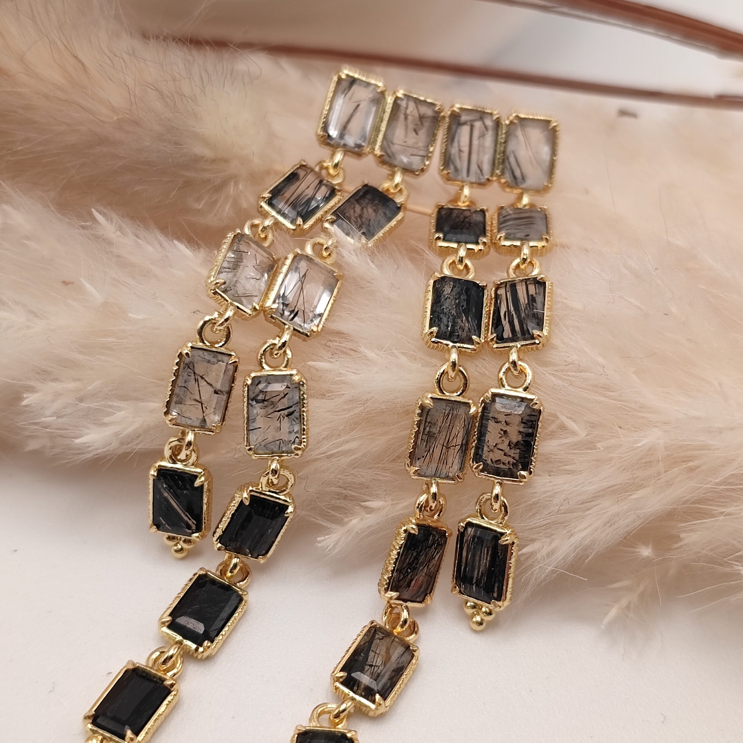 Boucles d’oreilles pendante en forme de ligne asymétriques montées d’un seul bloc avec plusieurs magnifiques pierres naturelles taillées en rectangle. Crochet en laiton.