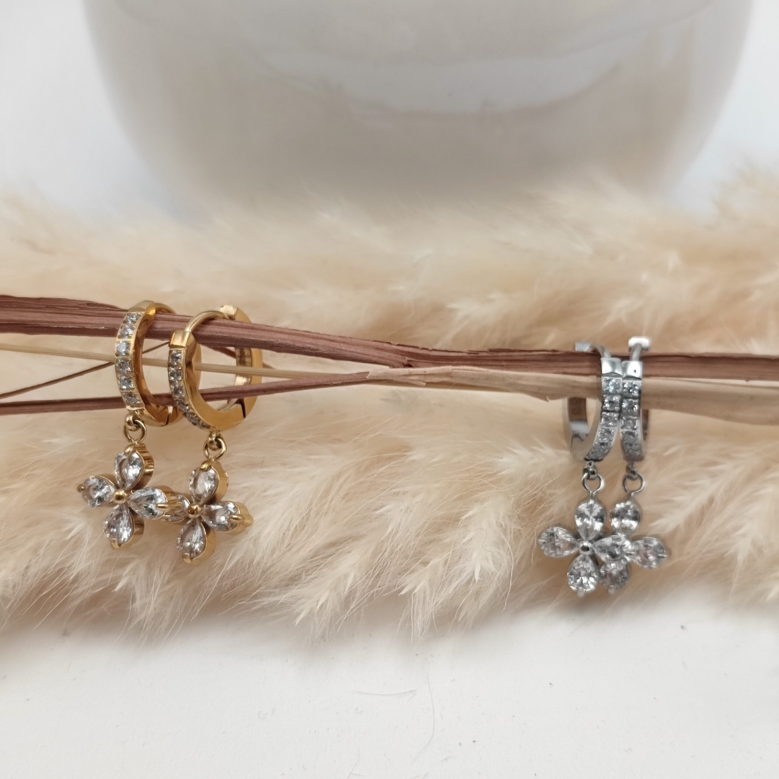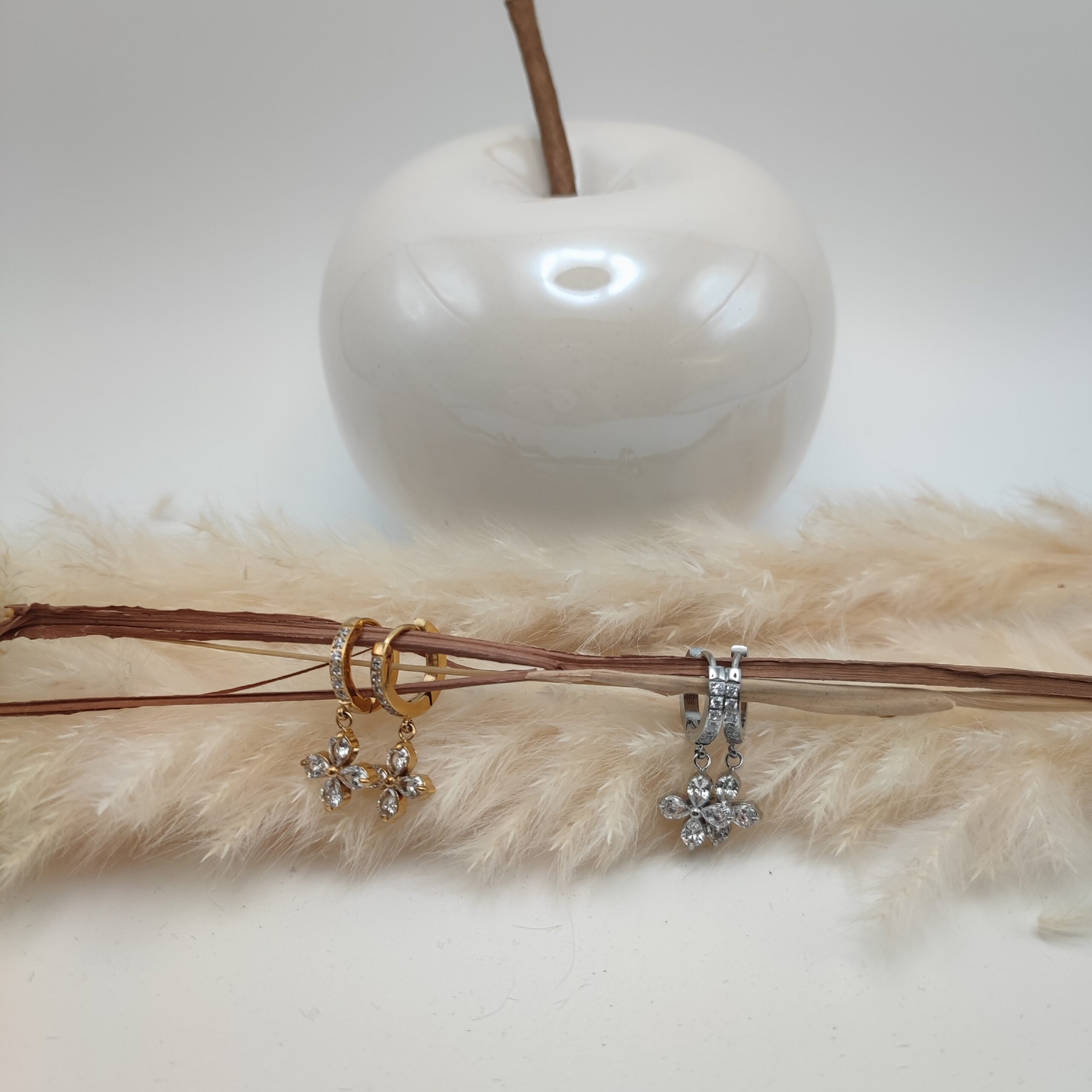 Boucles d’oreilles délicates, discrète en acier inoxydable doré ou argenté. Petites créoles sertis de zirconium et d’un joli trèfle en zirconium.