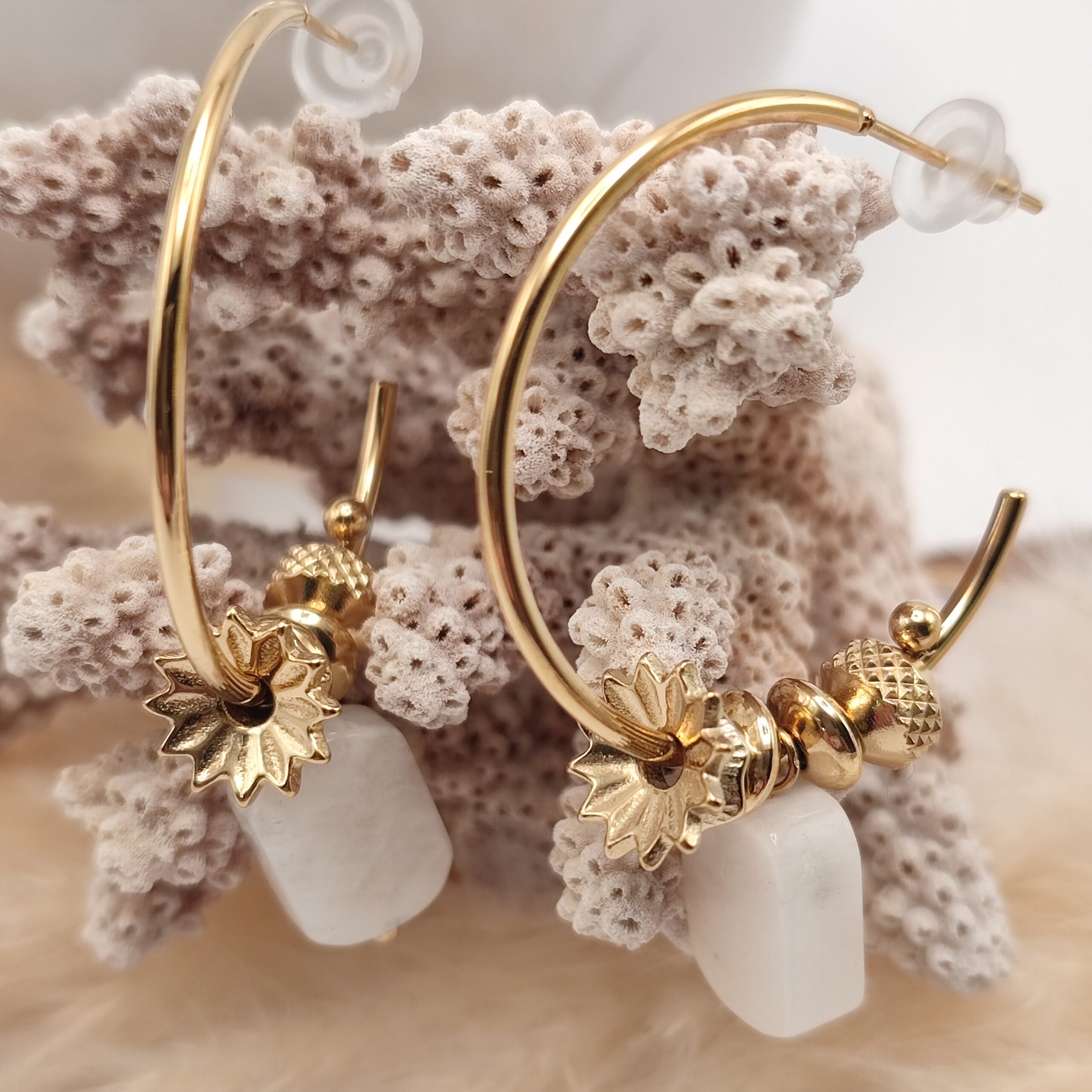 Boucles d’oreilles de type demi créoles pendantes embellies par des pierres naturelles et des perles en acier inoxydable dorées.