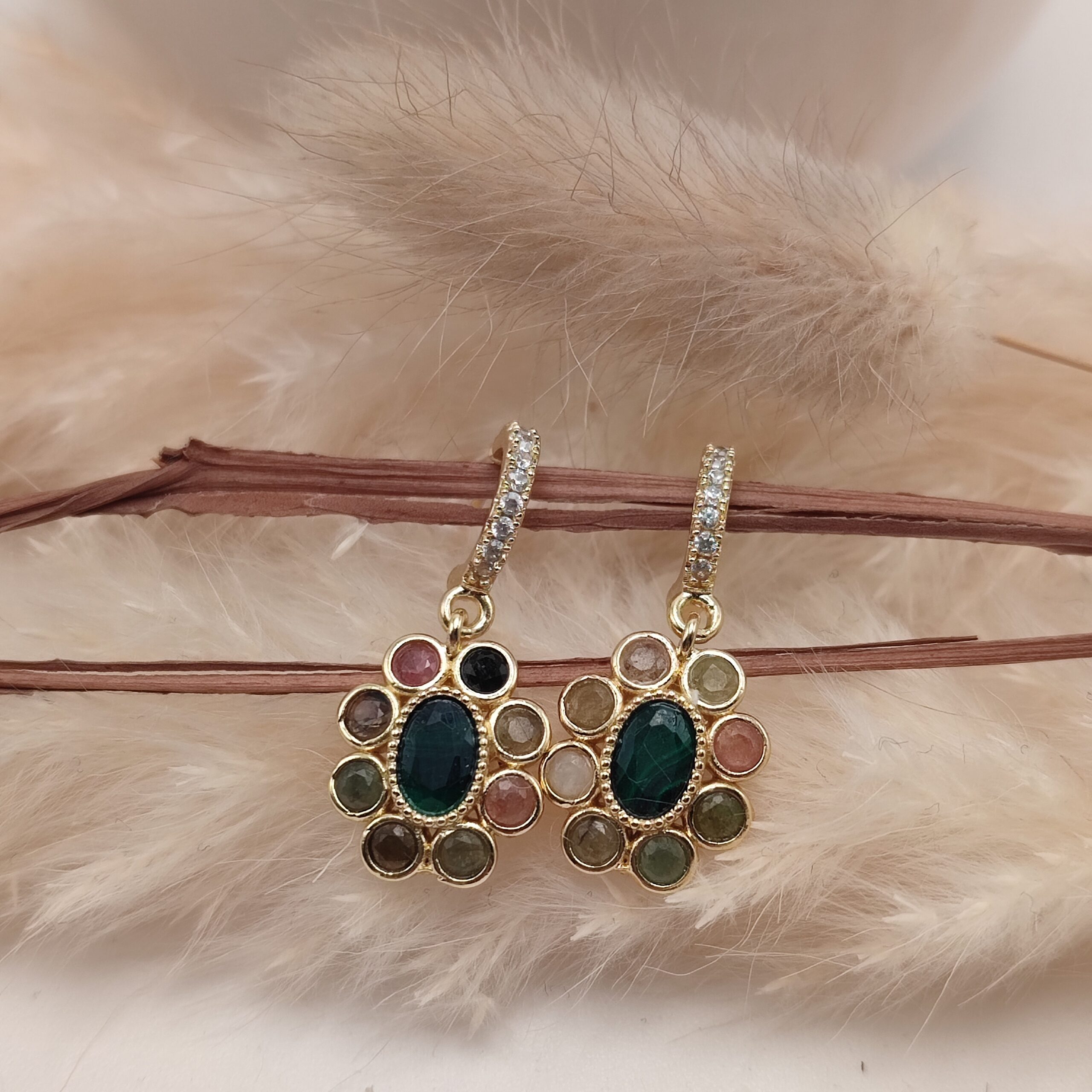 - Matières : Laiton, pierres naturelles: Tourmaline multicolore.