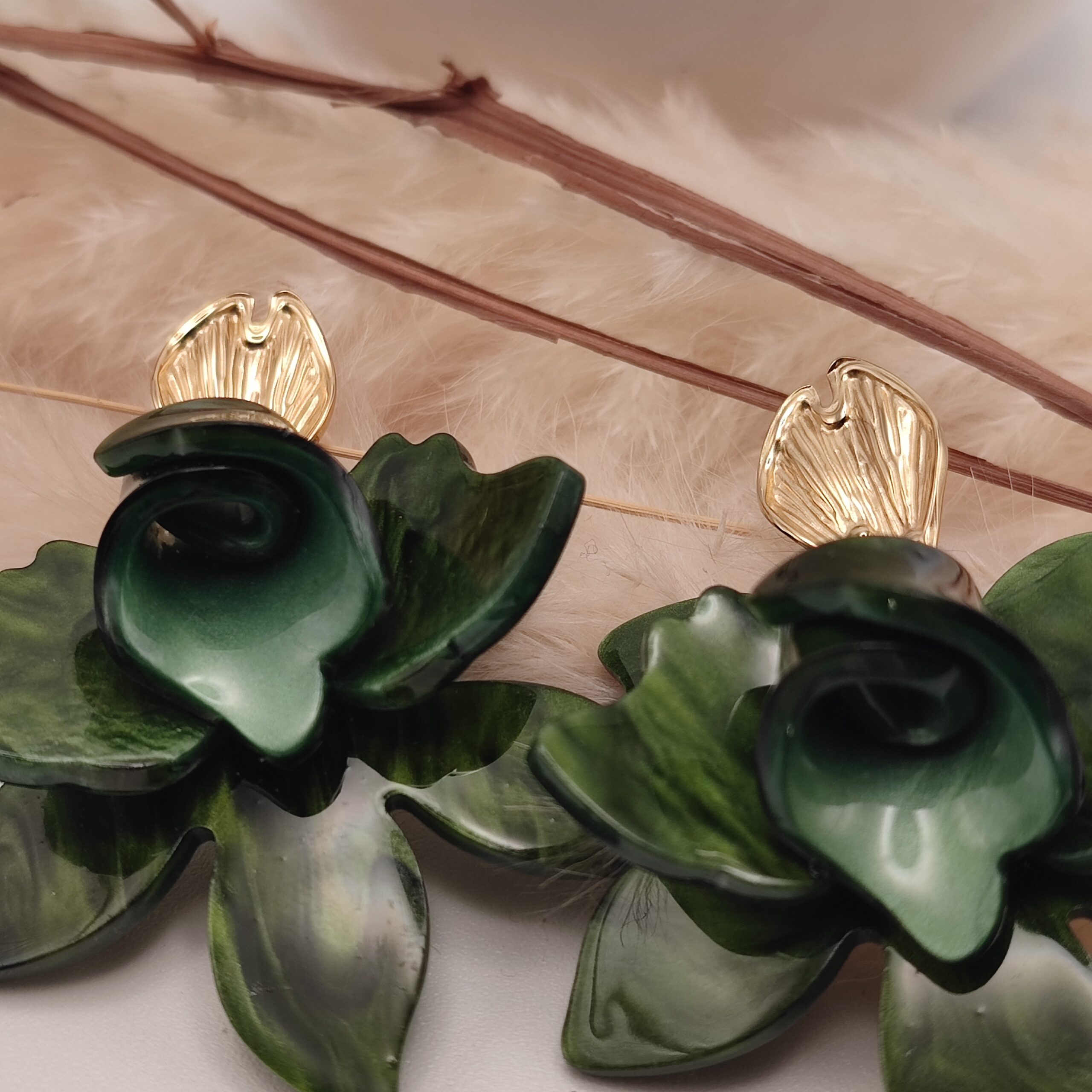 Boucles d’oreilles de type pendent en acier inoxydable avec une rose verte en acétate. Montées sur un crochet d’oreille en acier inoxydable.