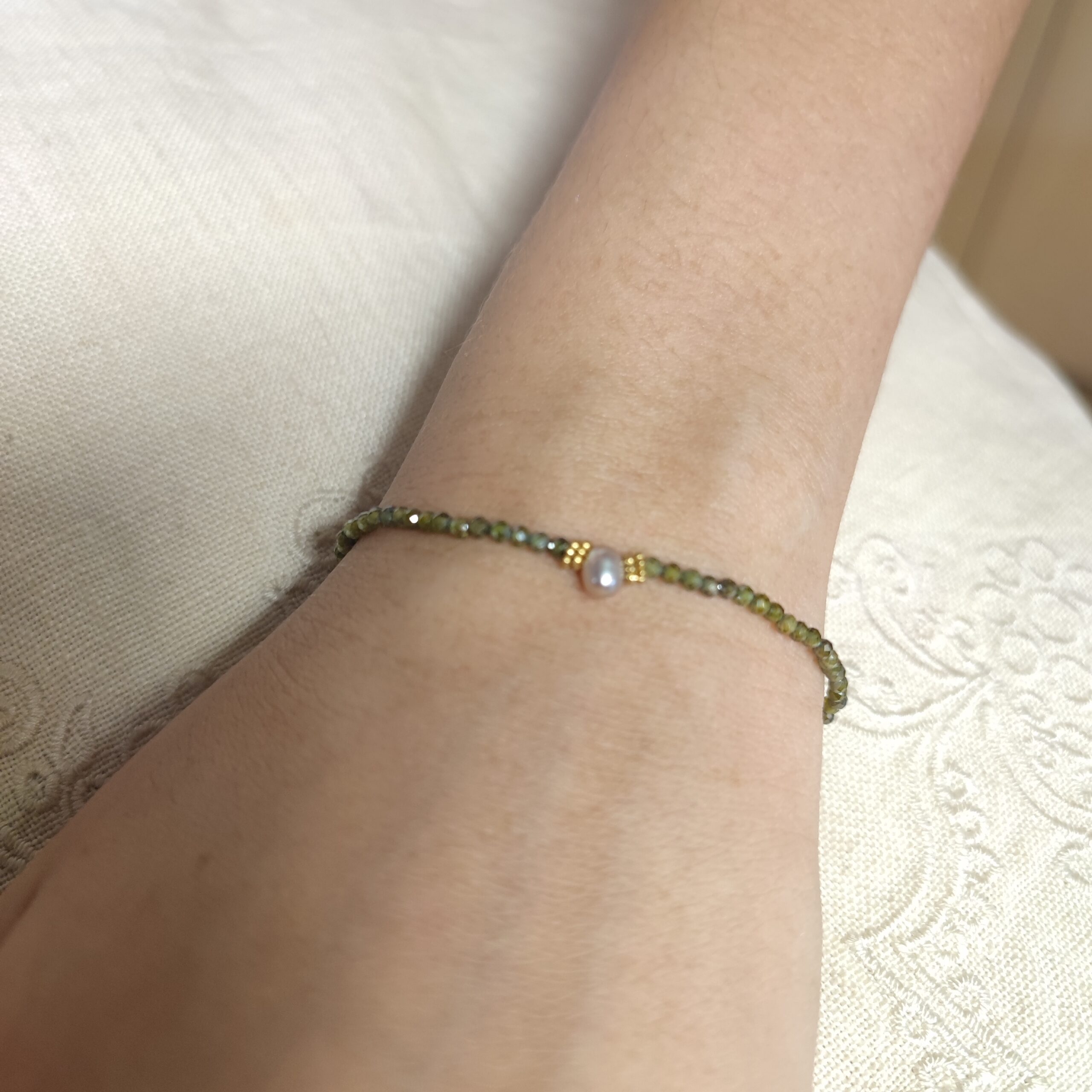 Bracelet fin en perles zirconium kaki et une magnifique perle d’eaux douces aux teintes rosée, sont montées sur une chaine fine en acier inoxydable doré.