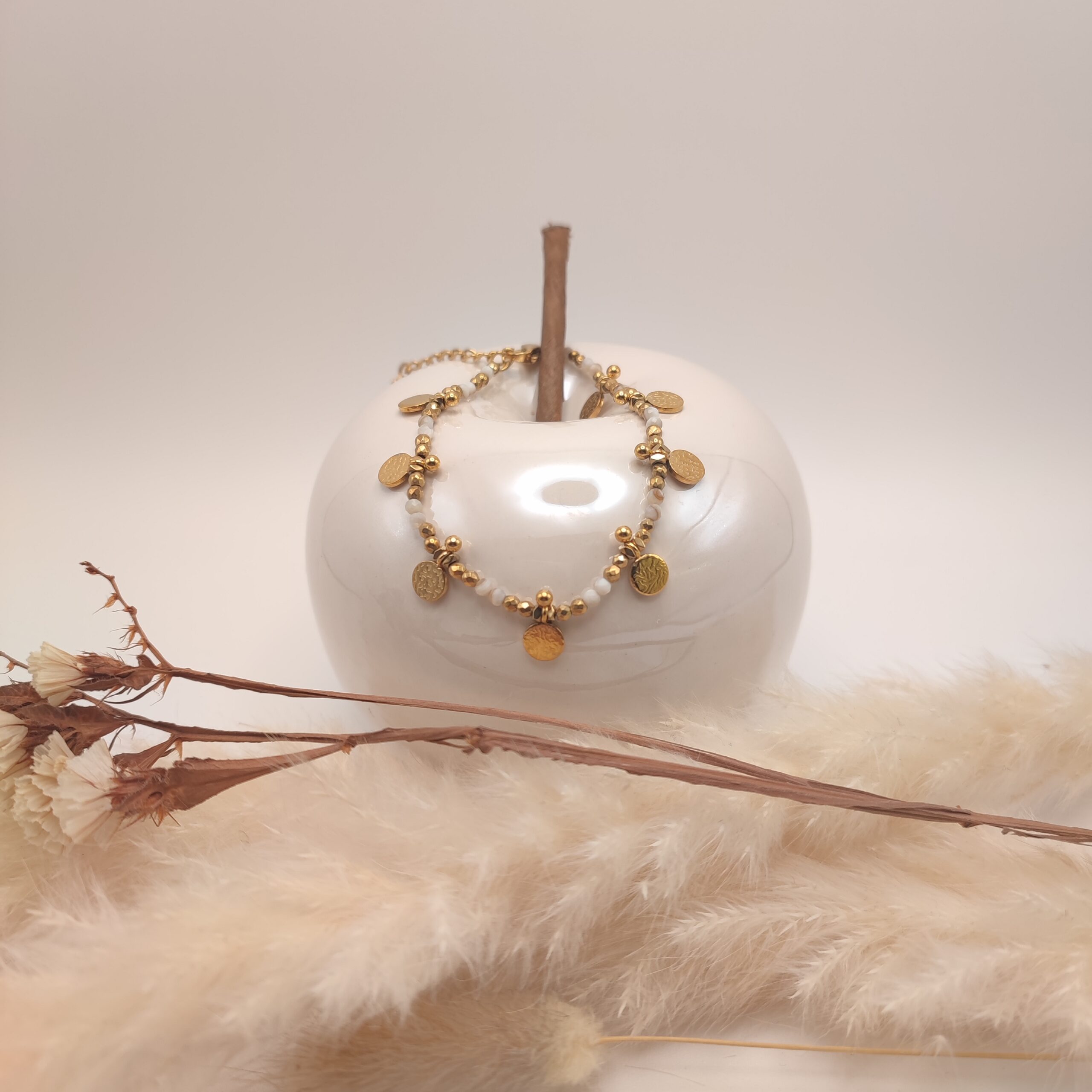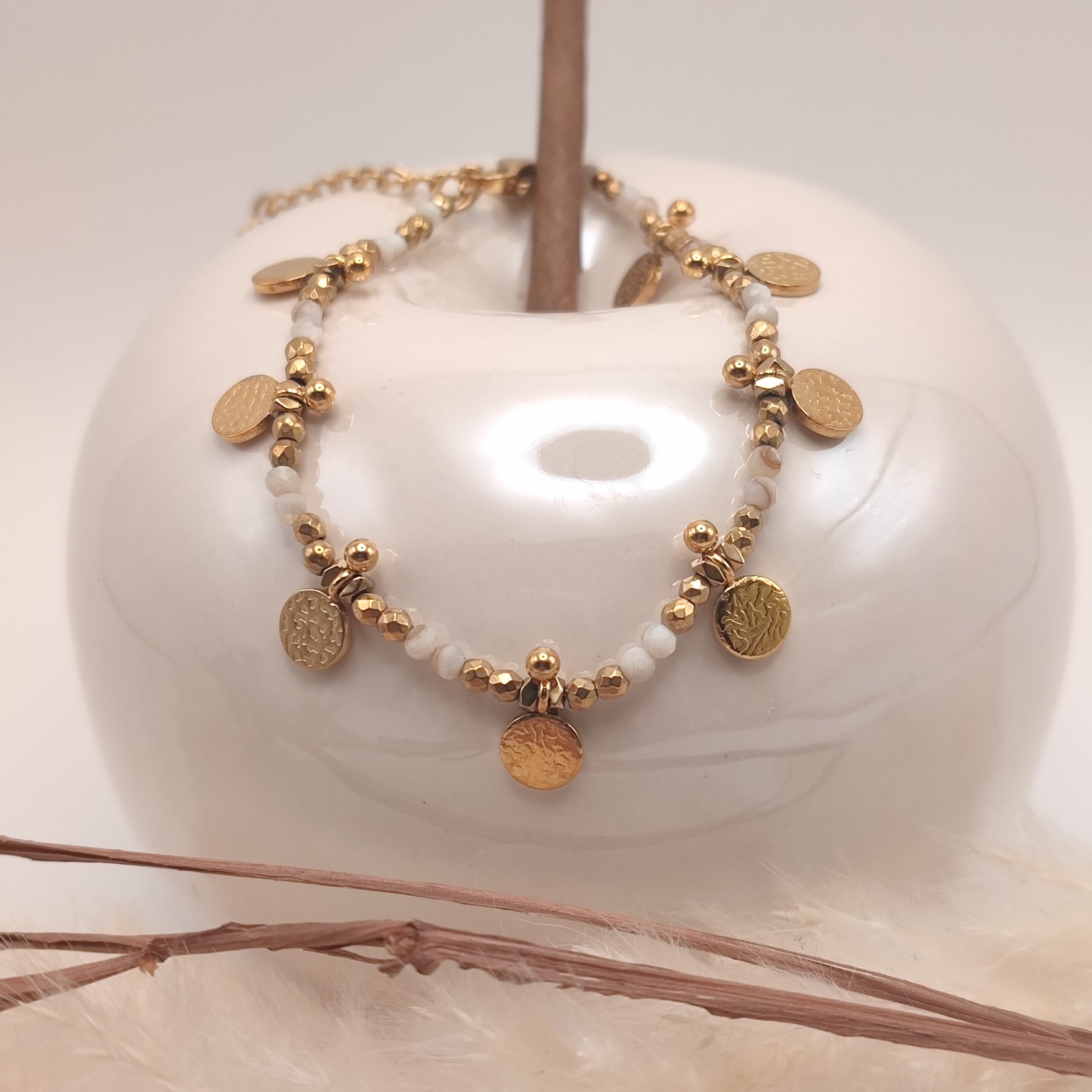 Bracelet fin en pierres naturelles d’Agathe blanche sont montées sur une chaine fine en acier inoxydable doré en alternance de sequins.