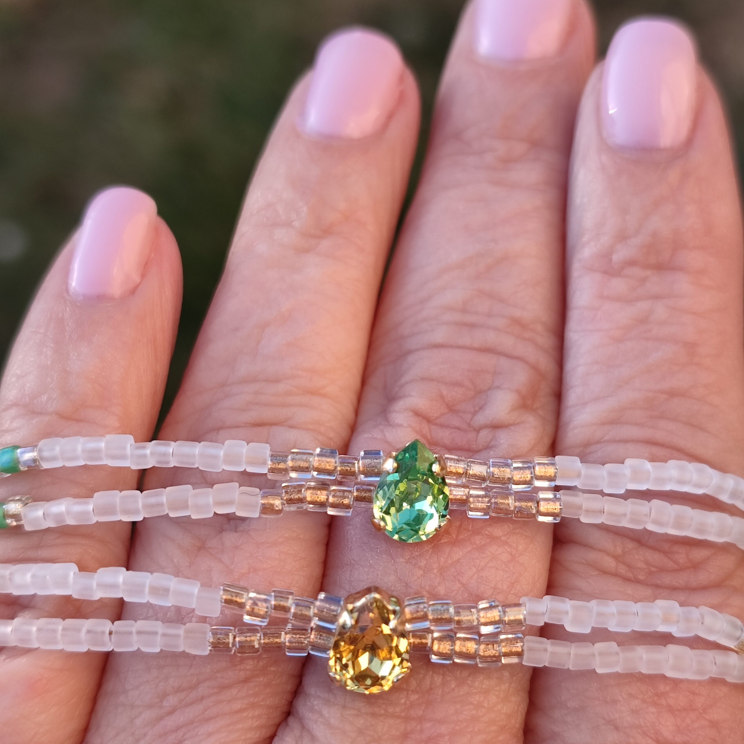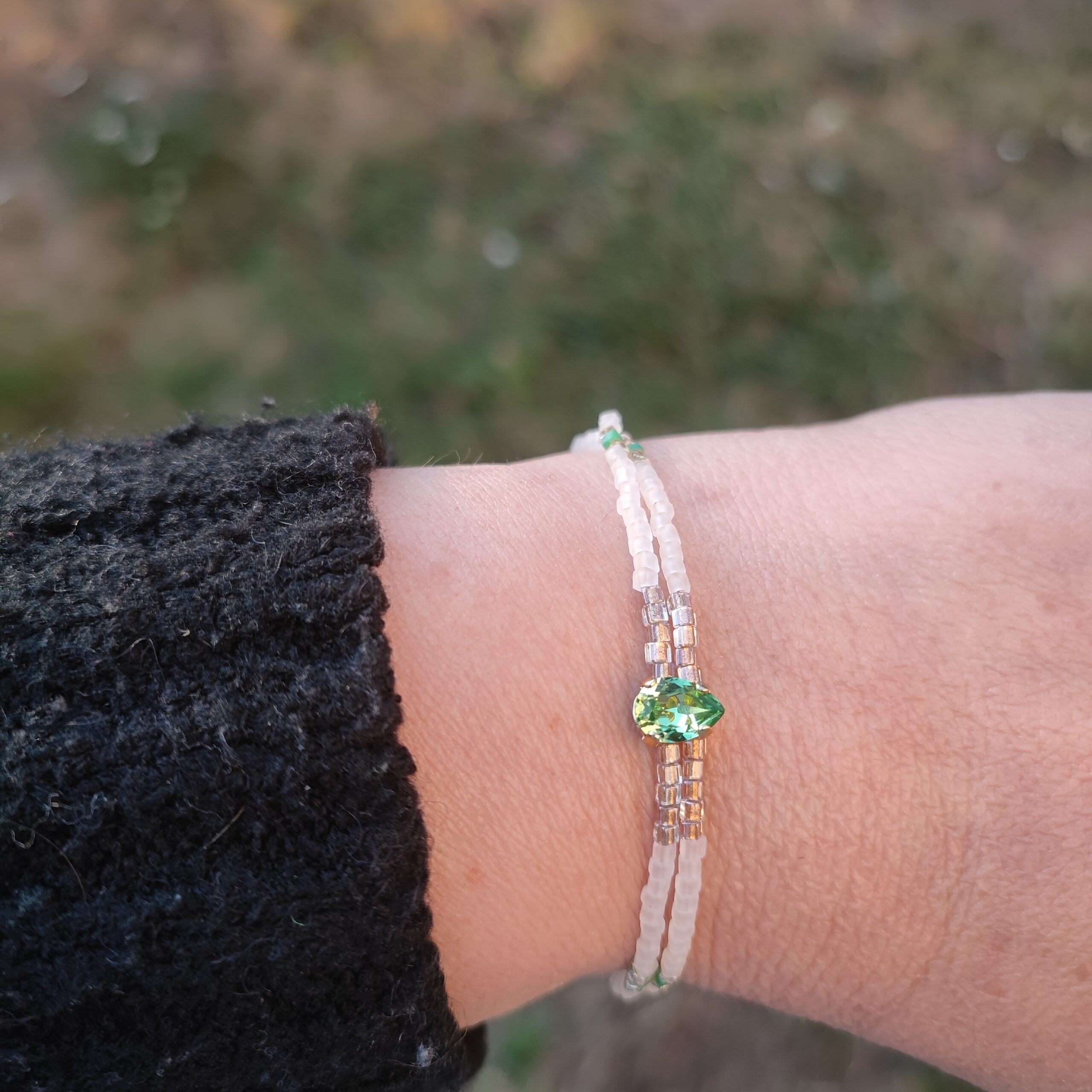 Bracelet fin double monté sur câble composé d’un cabochon Swarovski® serti à la main et de perles de verres Miyuki en forme de cubes. Fermoir et apprêts sont en acier inoxydable.