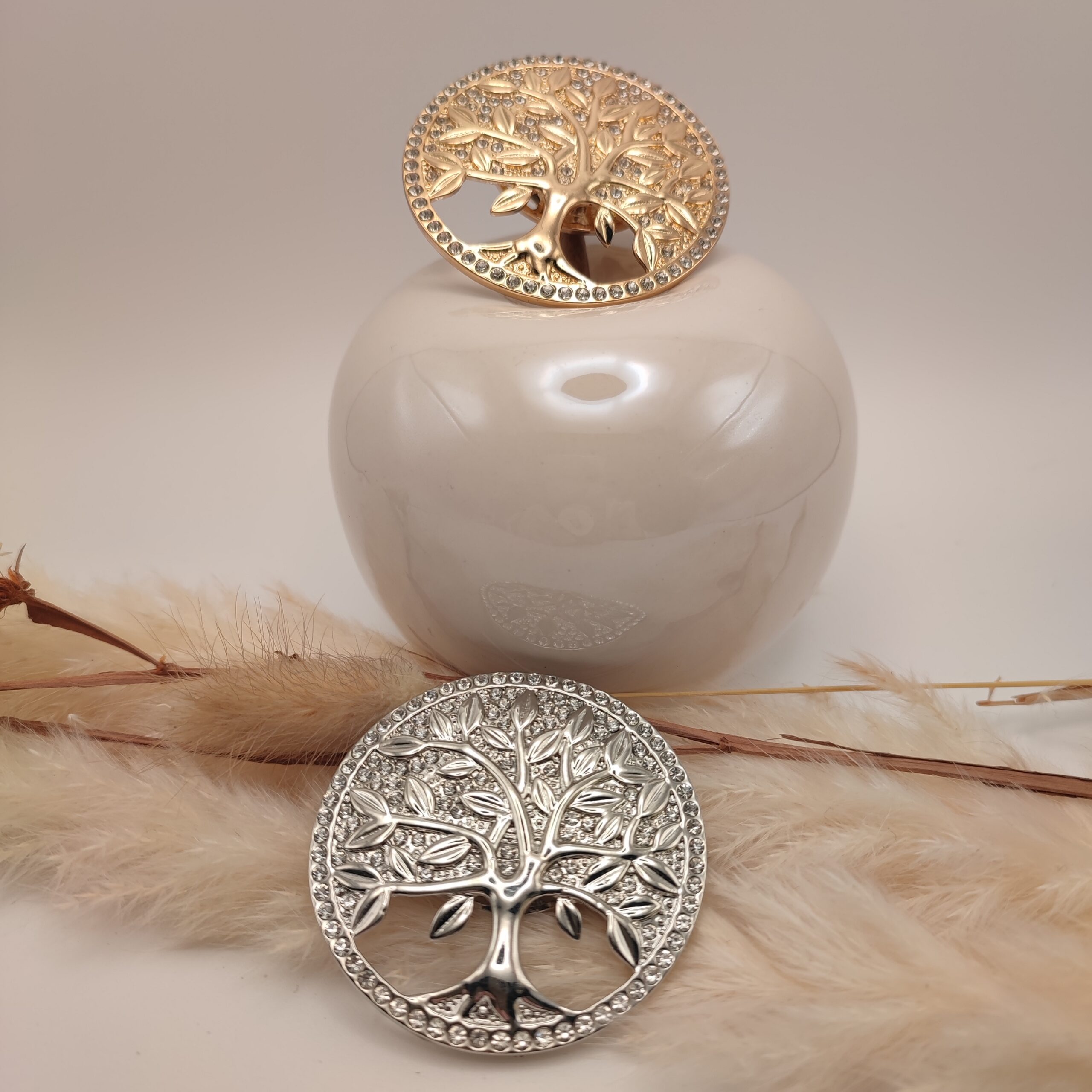 Broche fantaisie avec beaucoup de style, arbre de vie et strass. Existe en deux versions argenté et doré.