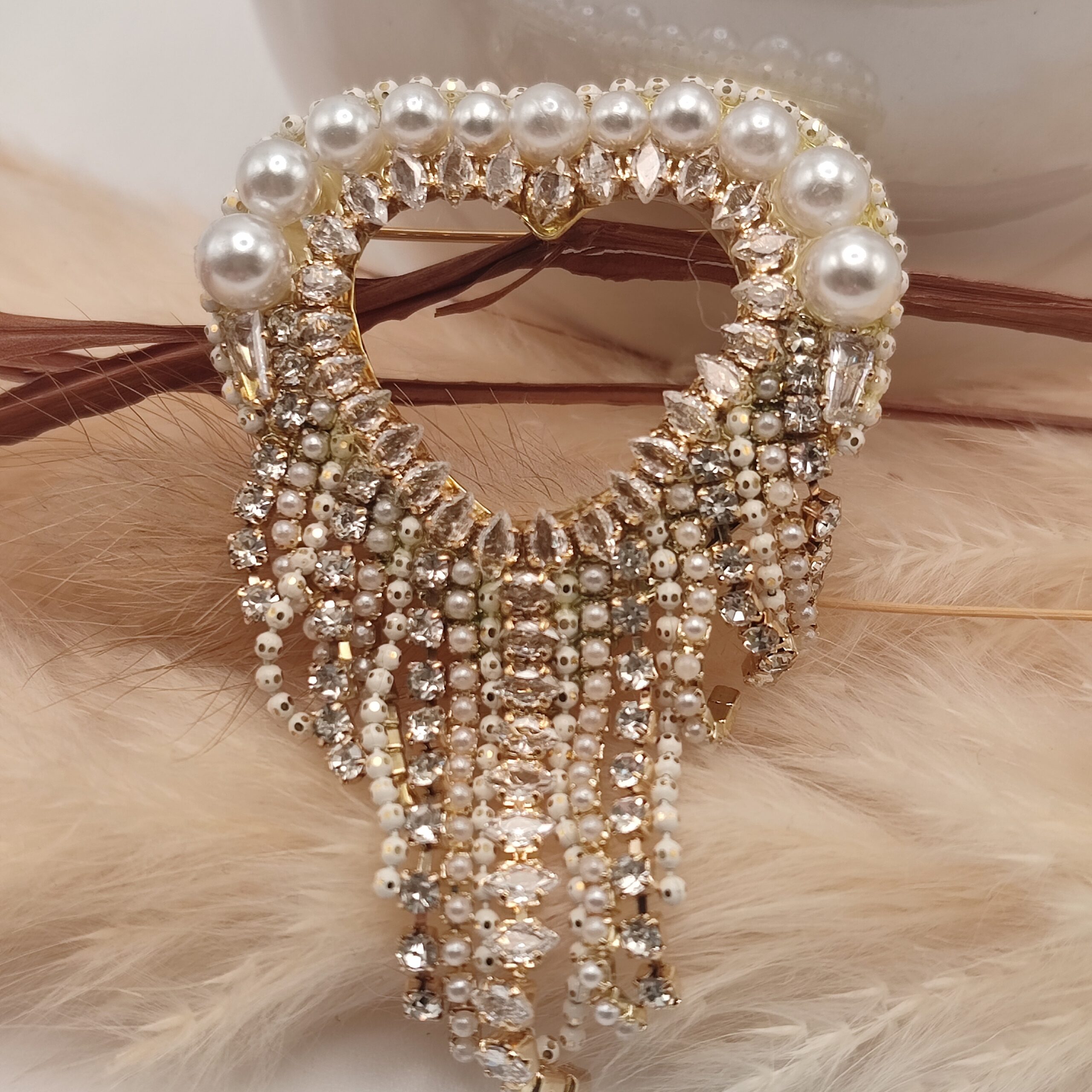 Broche fantaisie avec beaucoup de style un peu rétro avec sa cascade de strass et de perle. Existe en trois variations.