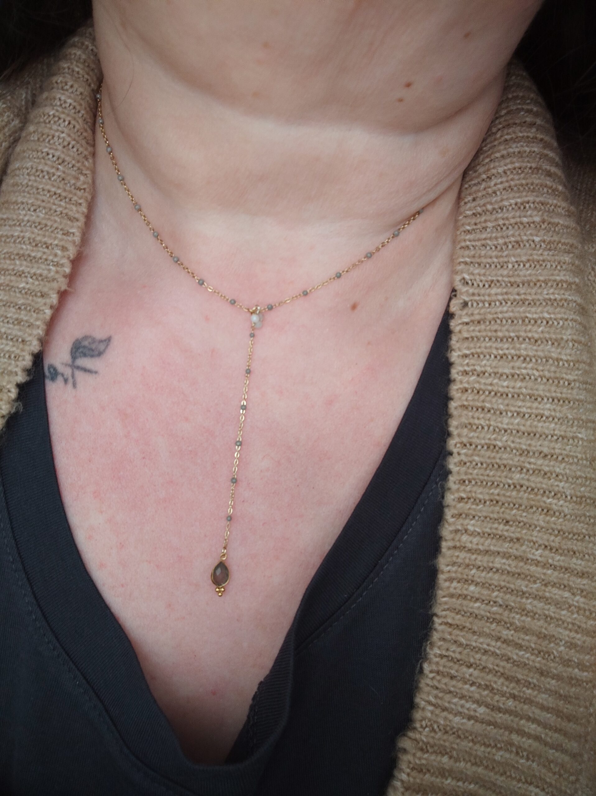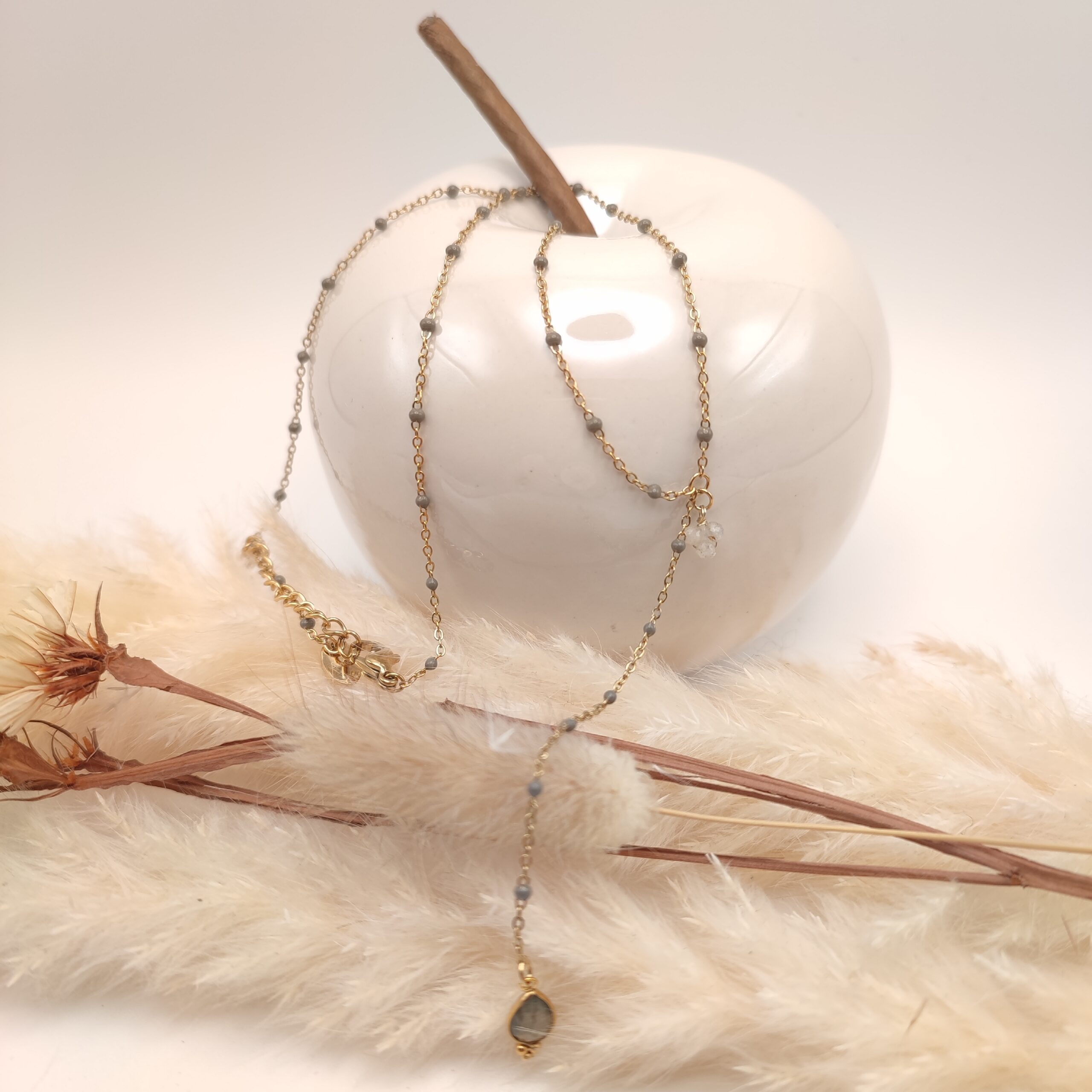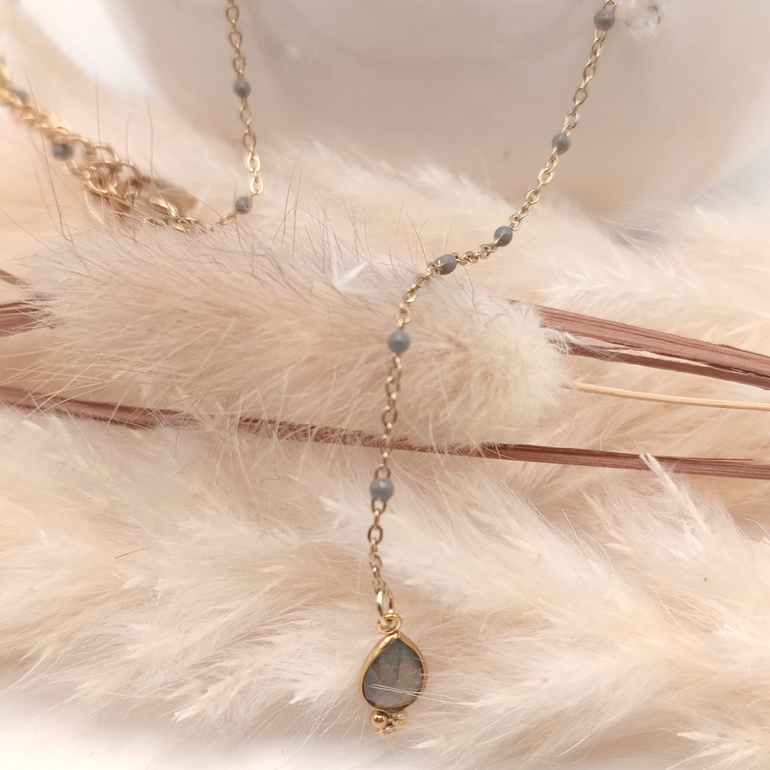 Collier Y sur chaîne en acier inoxydable composé d’une chaîne émaillée, de 3 petites pierres naturelles et d’un pendentif goutte en pierre naturelle Labradorite.