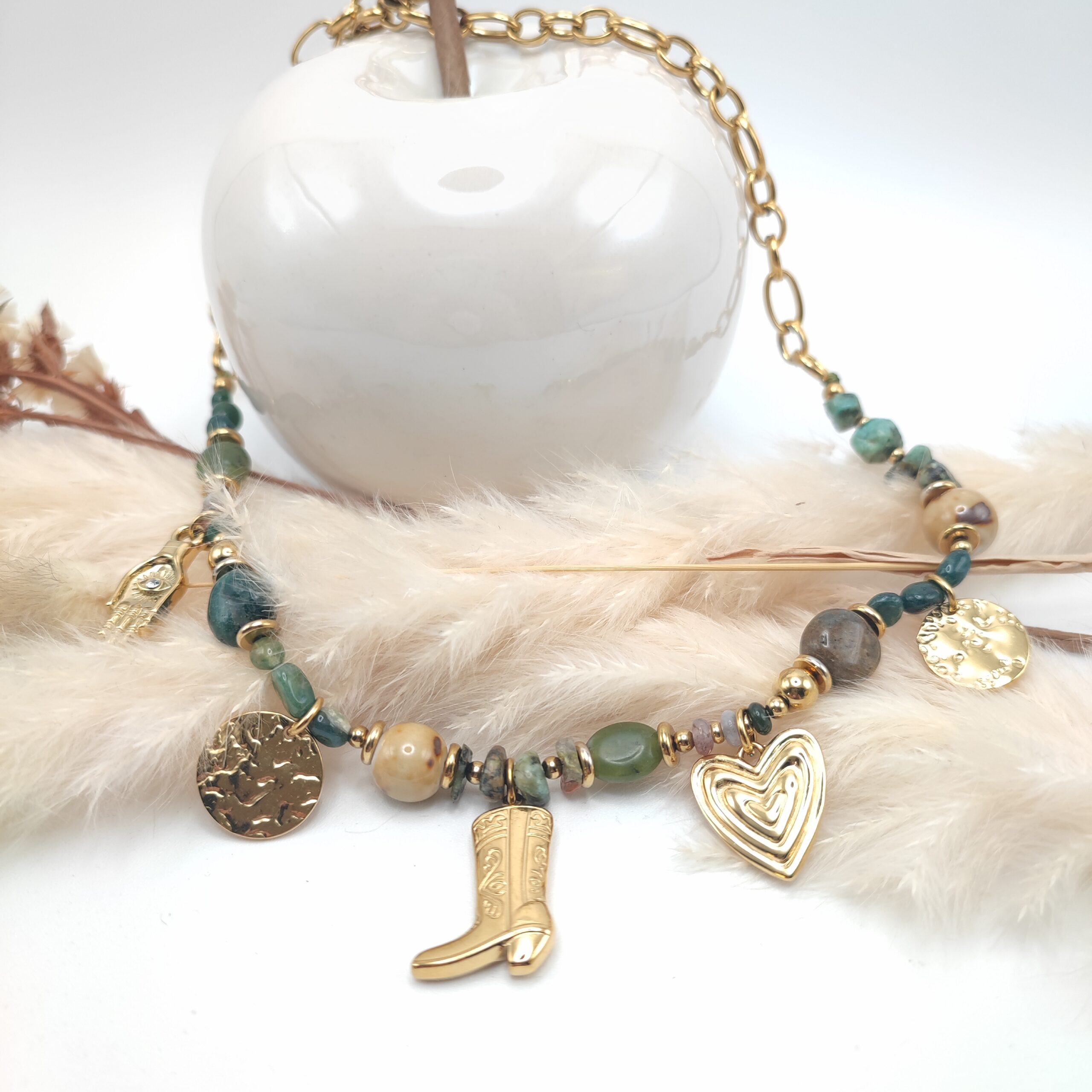 Sublime collier rond en pierres naturelles et charms mélangées, dans une tonalité bleu/vert et or. Sublime et collier imposant.