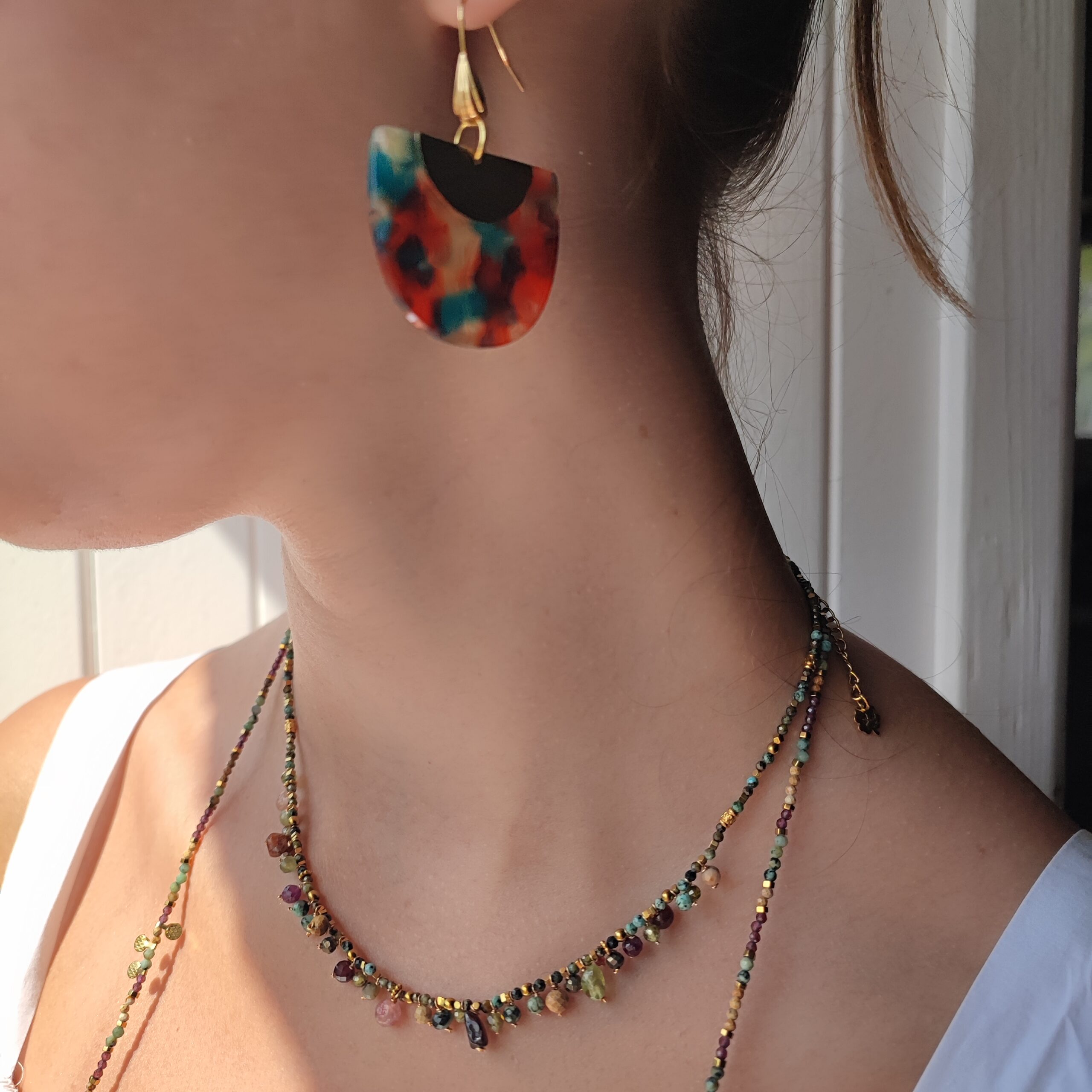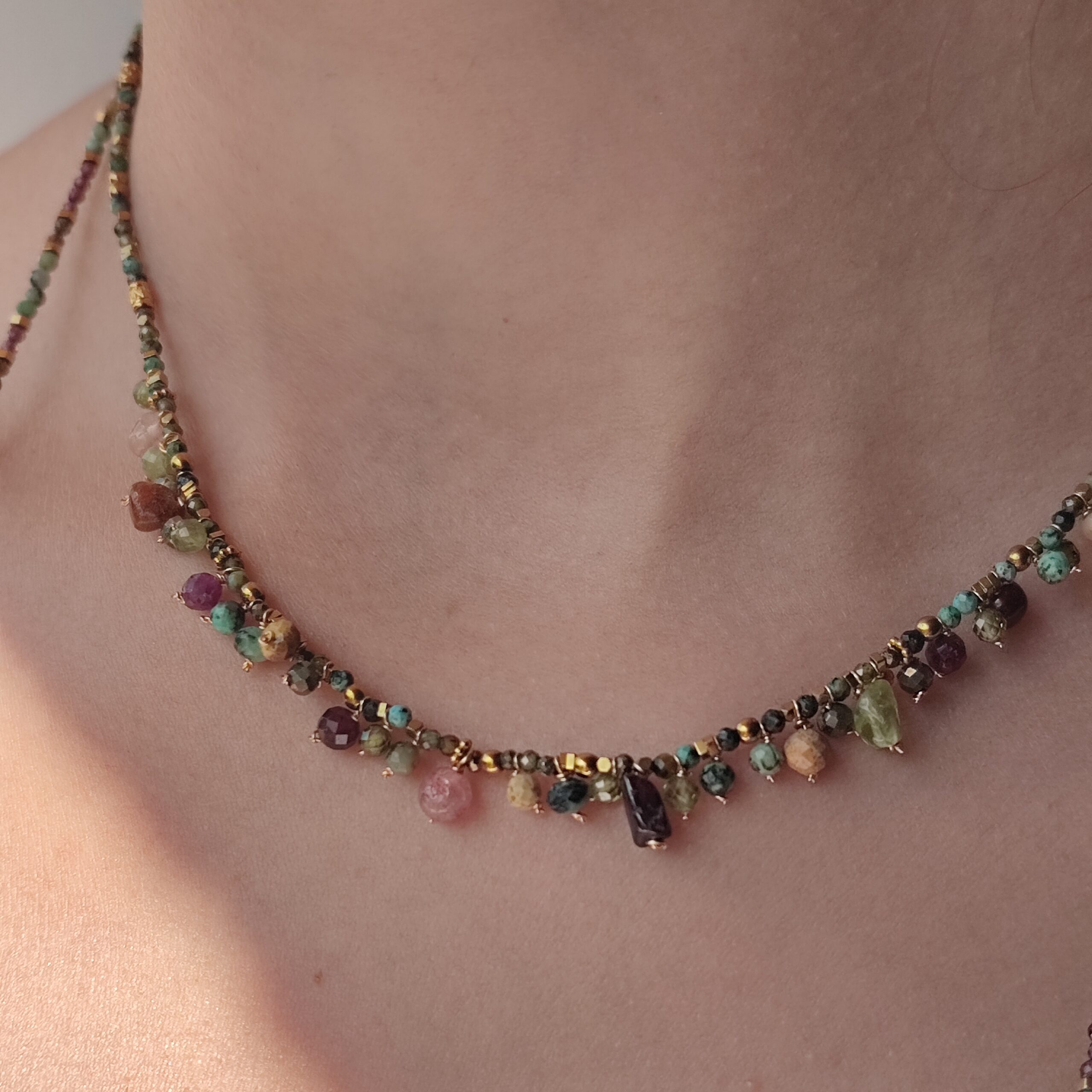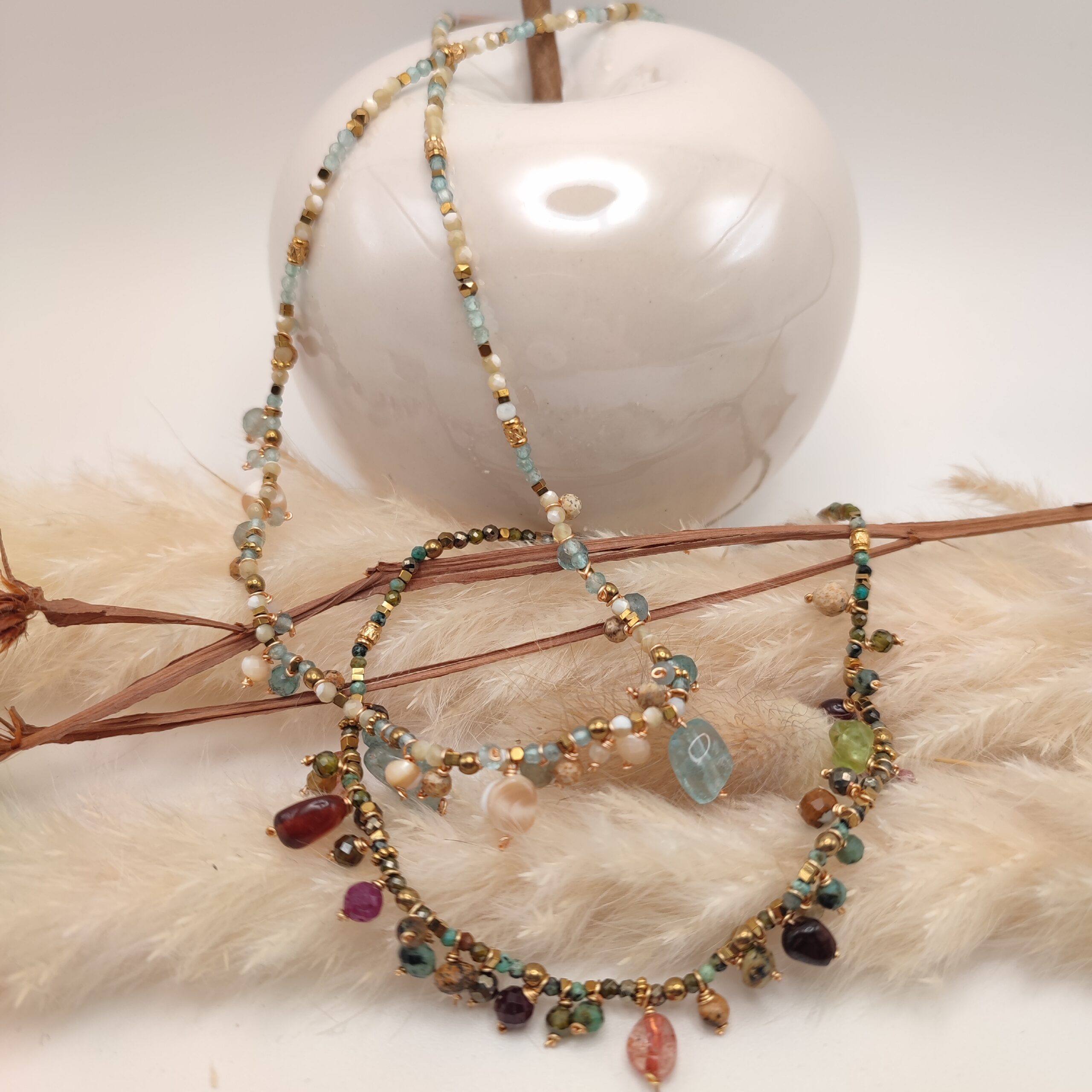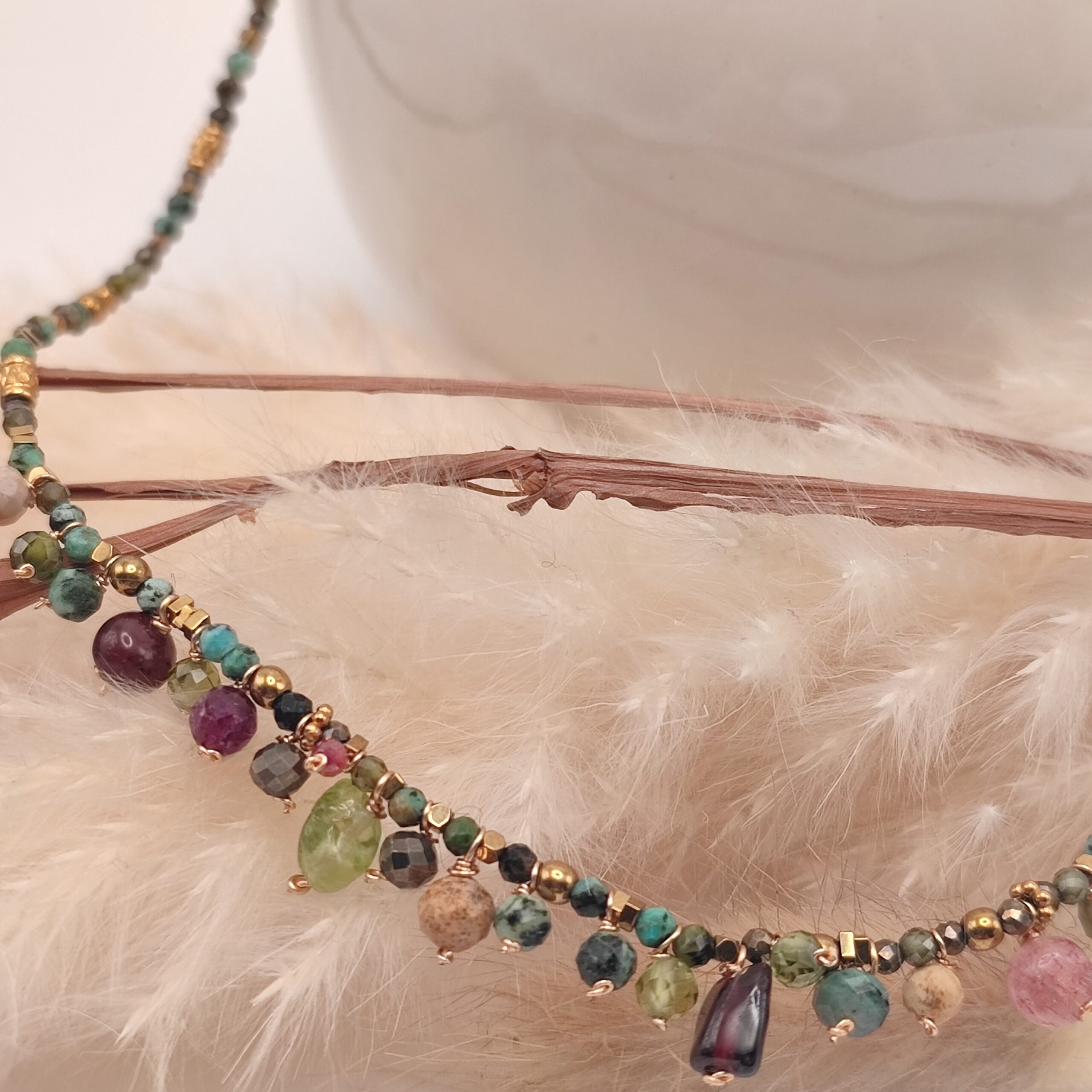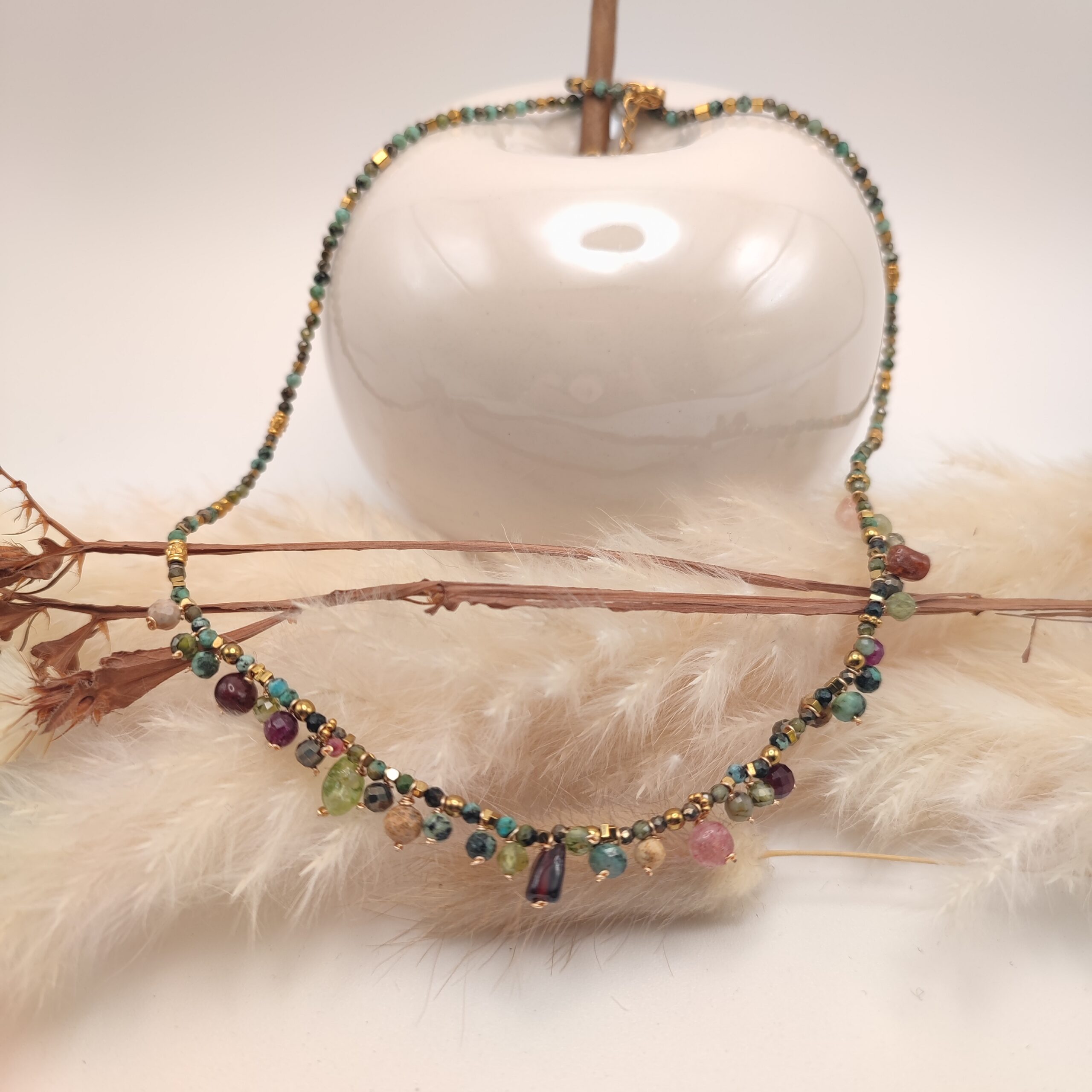 Sublime collier rond perlé de turquoises africaines et d’un mix pierres naturelles en pampilles. Plus perles d’acier inoxydable doré séparatrices. Sublime à tendance bohème.