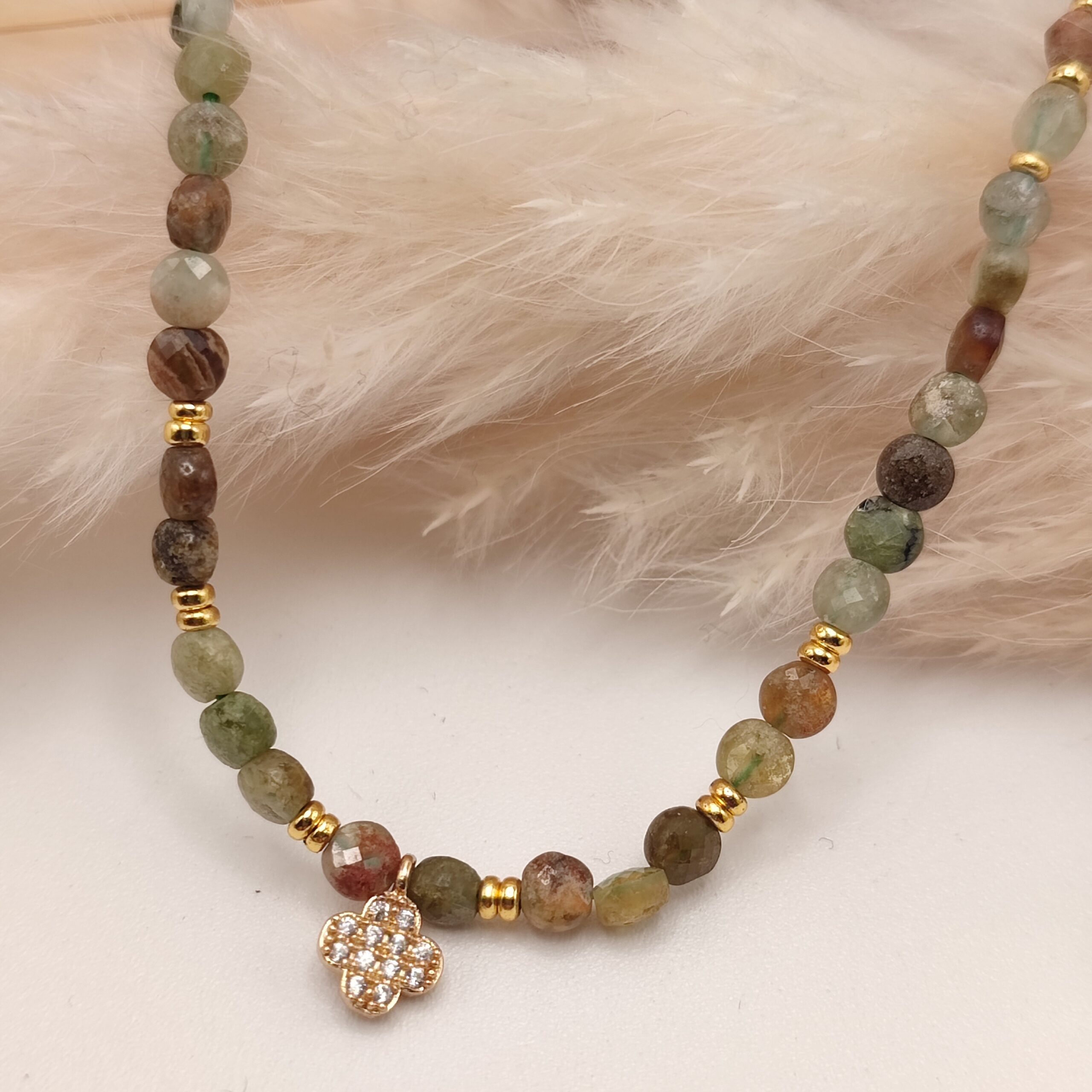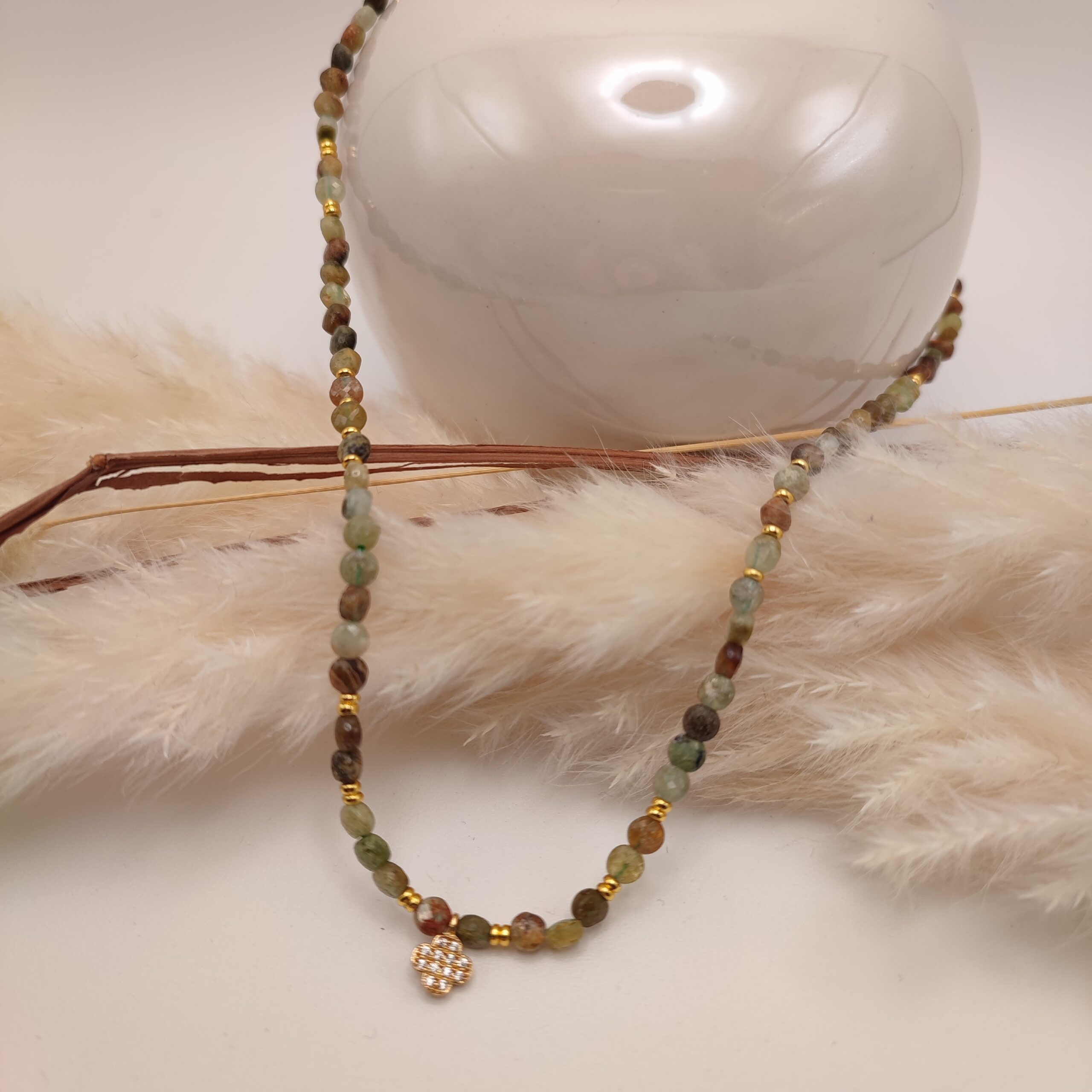 Sublime collier rond en pierres naturelles facettées de serpentine en forme de palets, dans une tonalité de vert et doré. en centrale un pendentif en forme de trèfle strassé.
